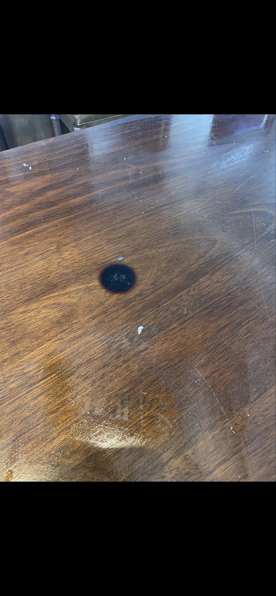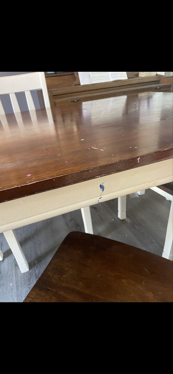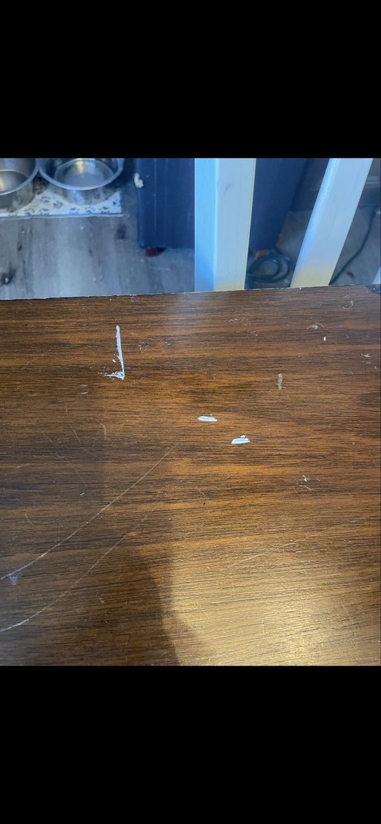 VenmoOld crafting table. Has some dents. Has some paint marks. And an old burn spot. Made of some wood like material. Still holds your food. Use a table cloth if you want. I won’t care.