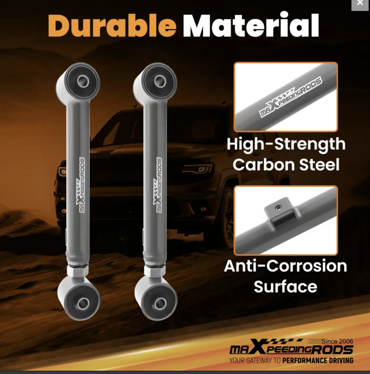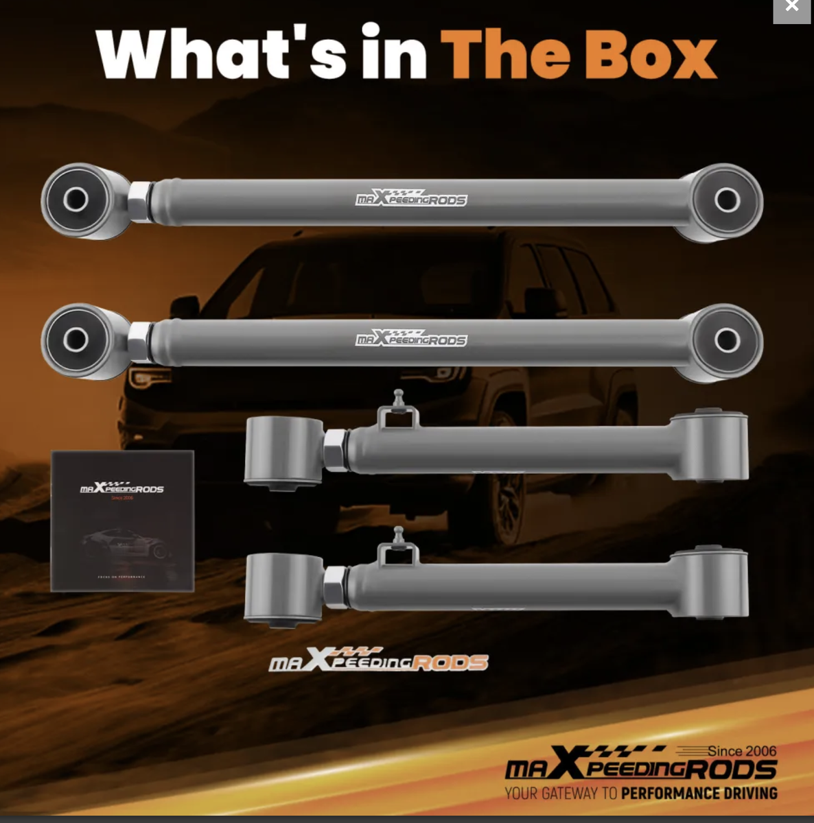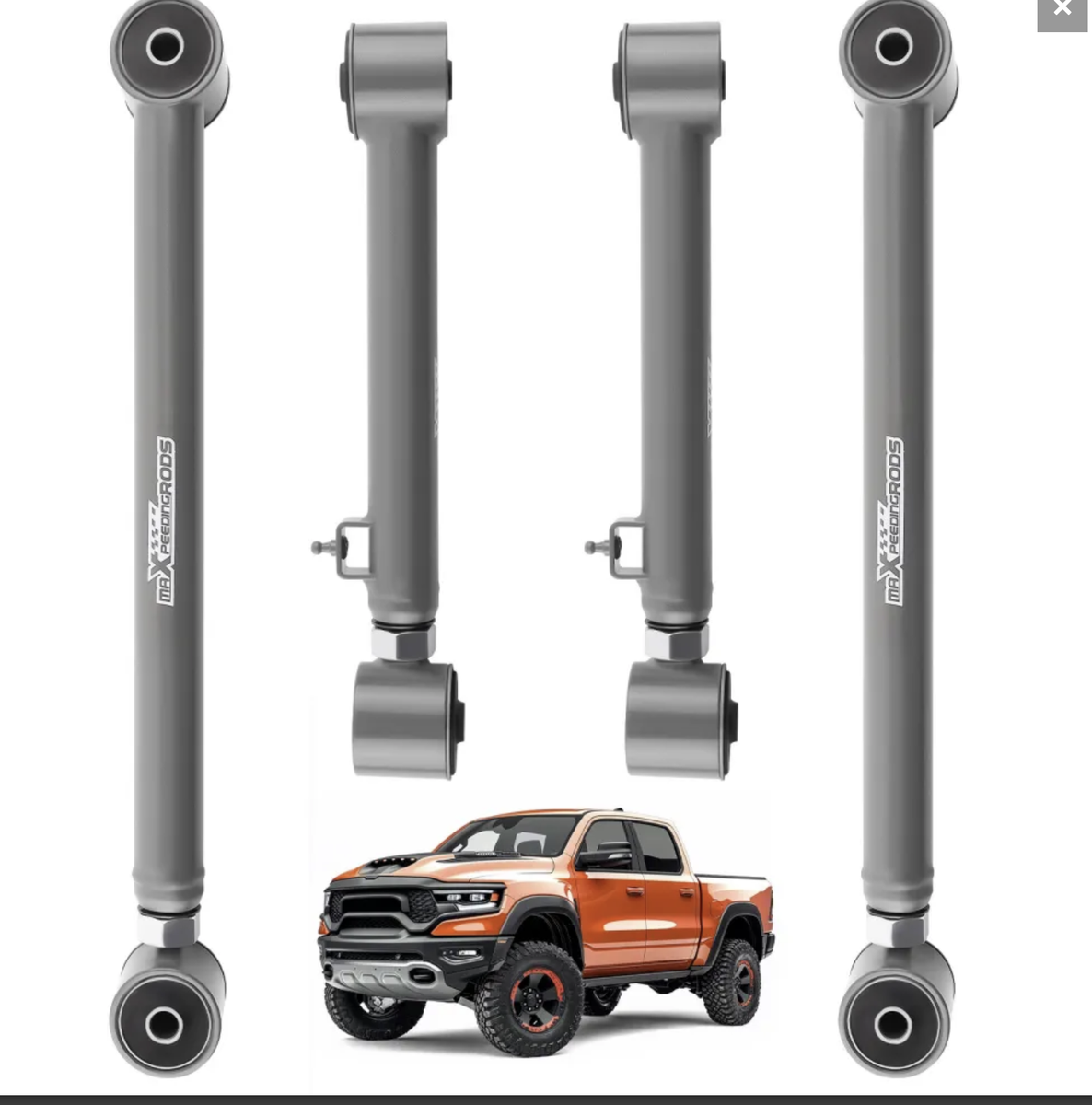 Package included:2× Rear Lower Control Arms,Adjustment range:587-667mm 2× Rear Upper Control Arms,Adjustment range::403-483mm Weight:16400g dimention:813117cm Placement on Vehicle:Rear Material:steel Surface finish::Powder coated