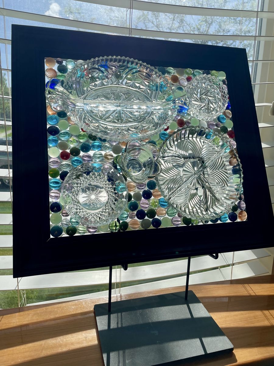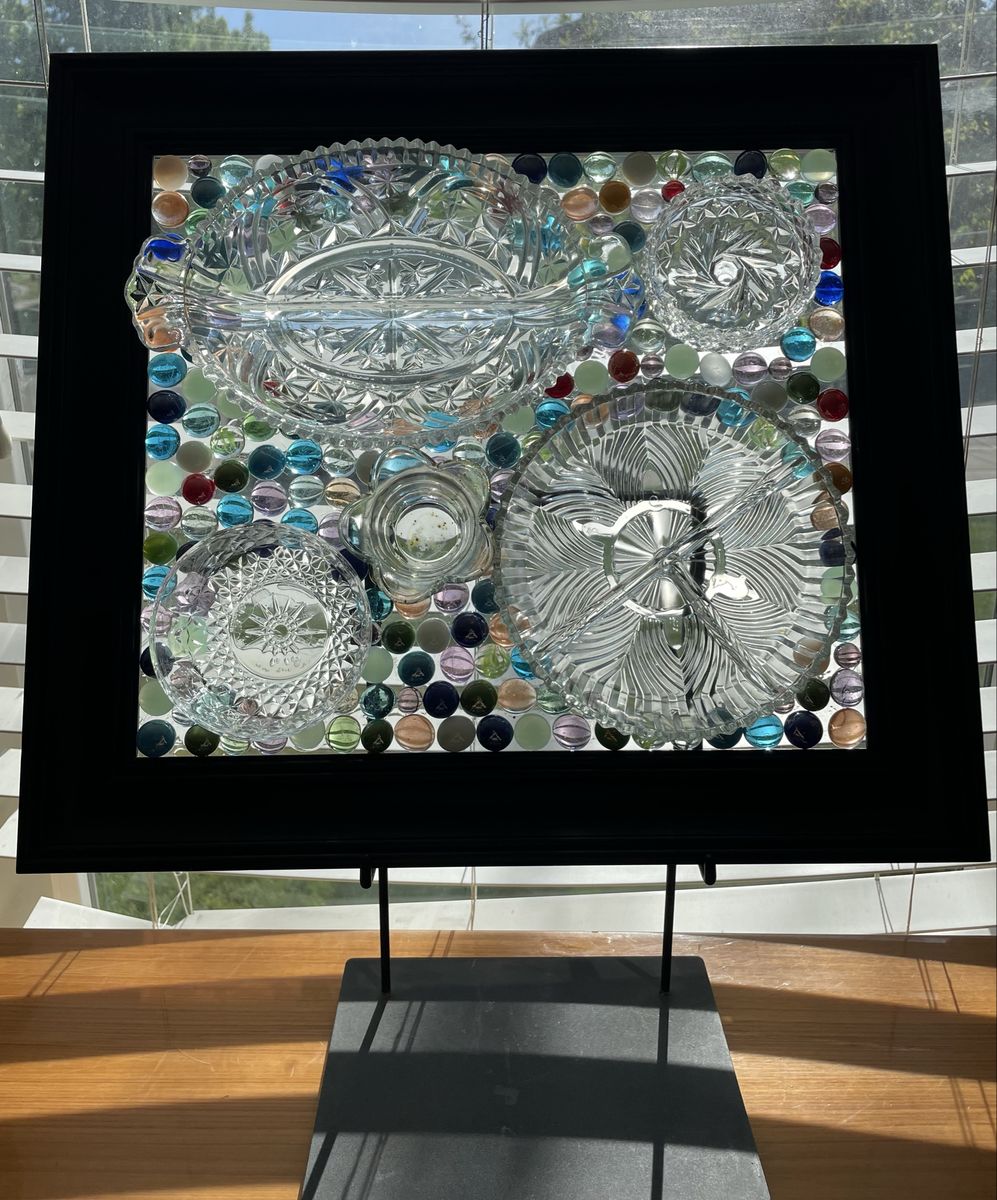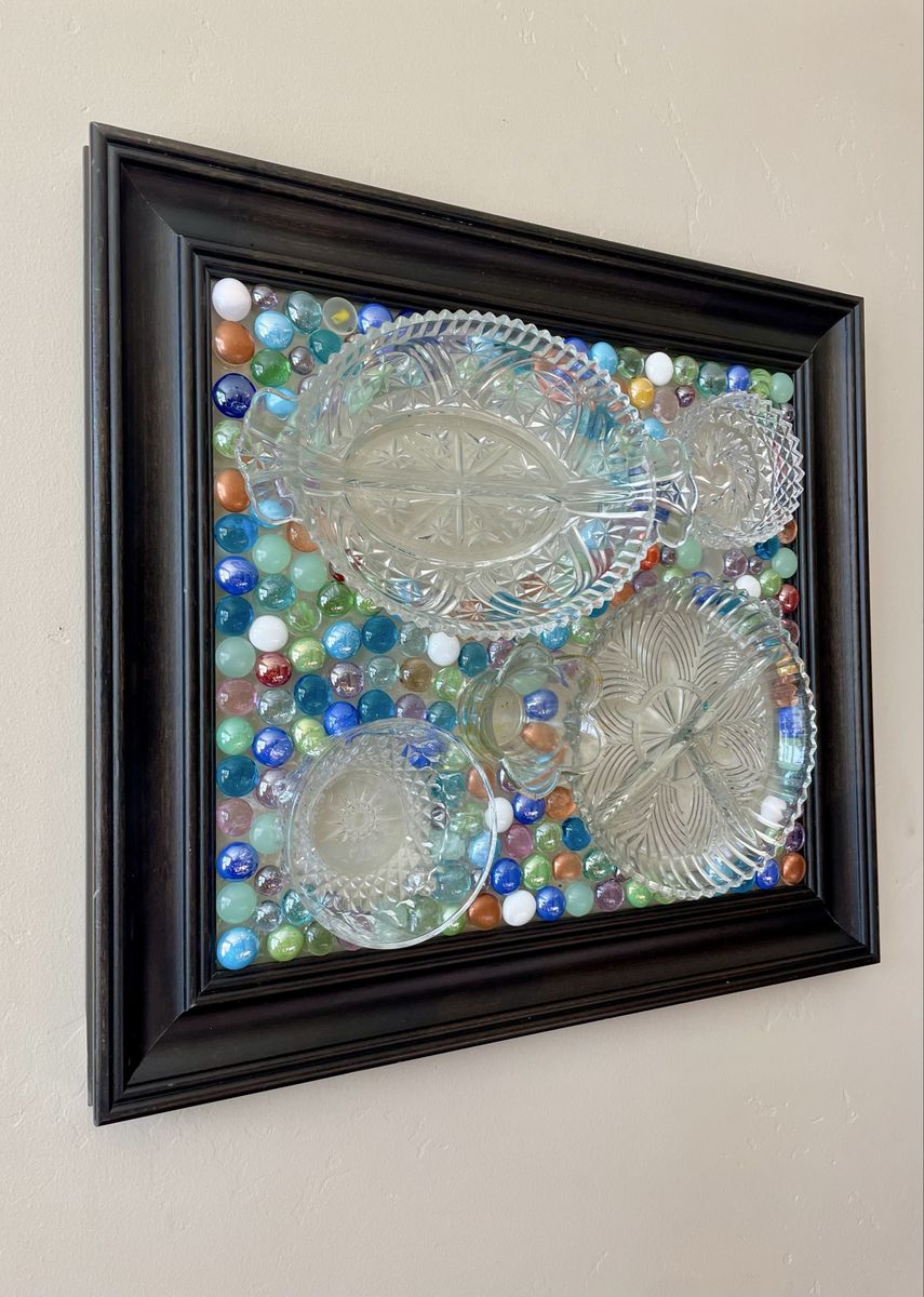 VenmoGorgeous one of a kind vintage dish preservation wall art. This stunning piece of art was handmade from precious antique dishes with colorful glass beads & framed in espresso brown.