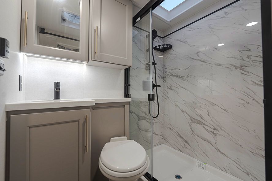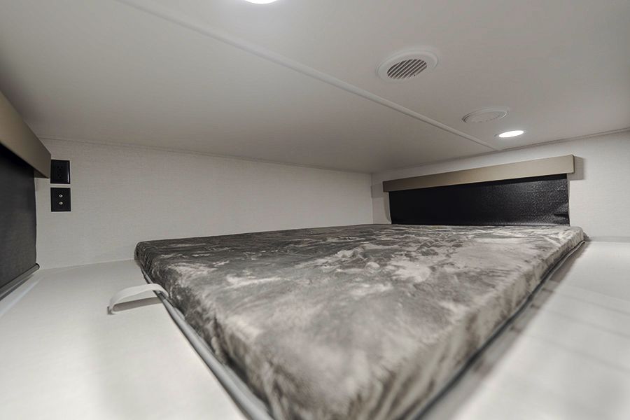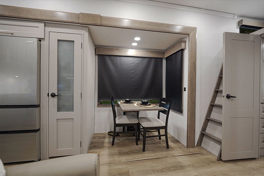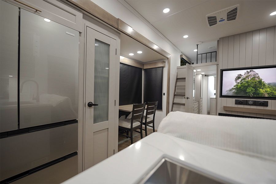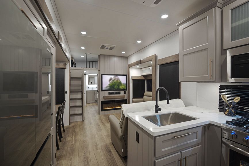It has two bedrooms, a loft, and two full bathrooms so everyone has their own space. The living area is large with multiple slides, and the kitchen has a full residential fridge and plenty of room to actually use it.