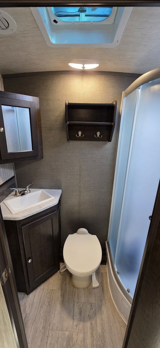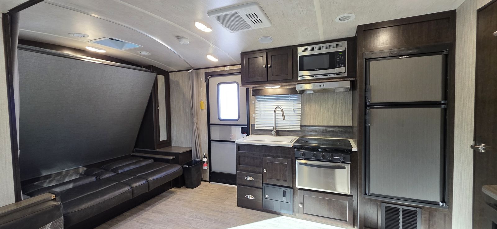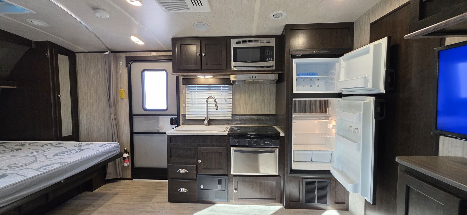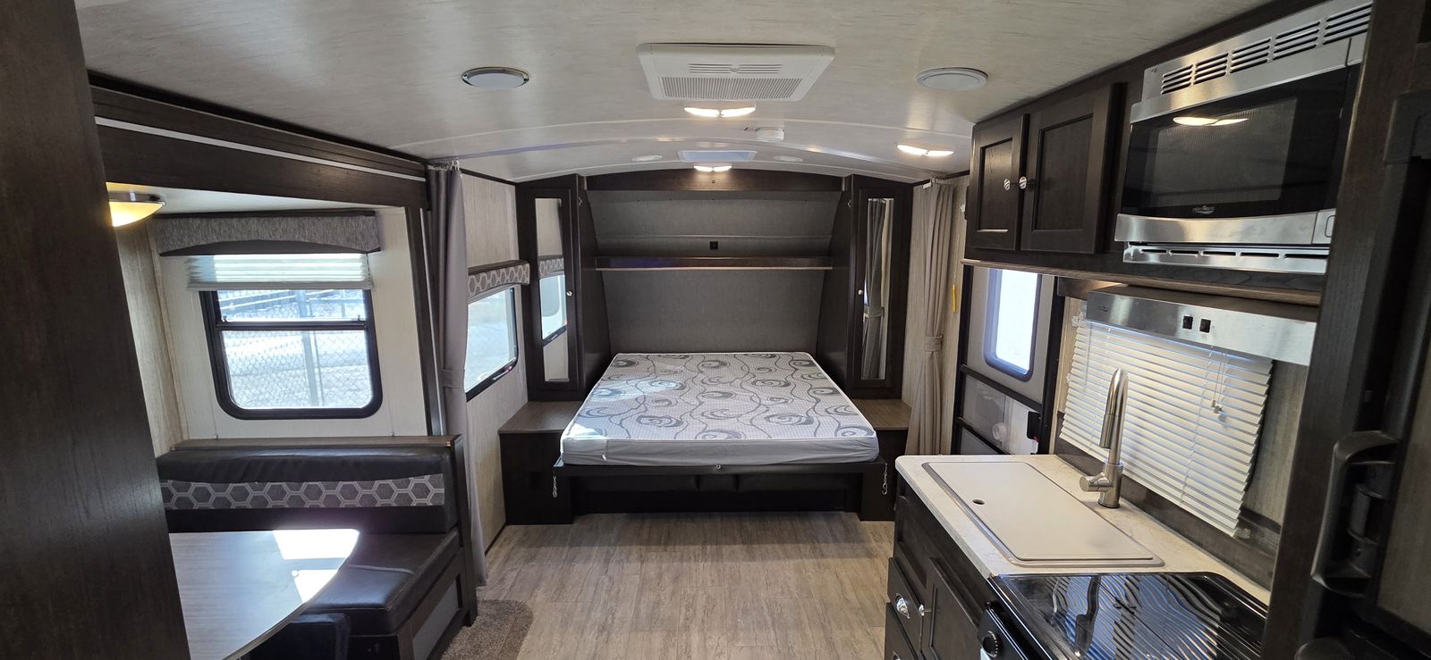 This is a highly desirable floorplan with the front Murphy bed, giving you both a comfortable sleeping area and a full living space during the day. Lightweight and easy to tow with most half-ton trucks and SUVs.