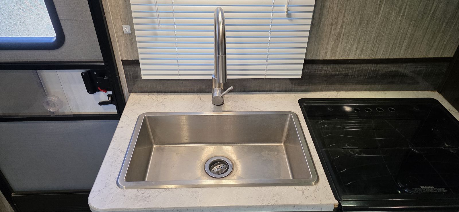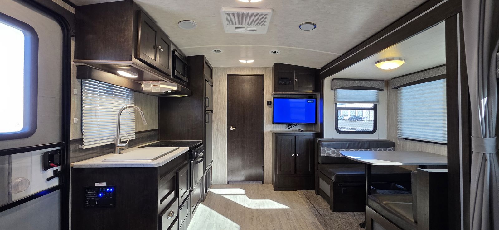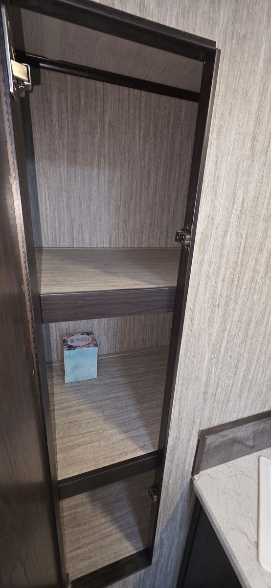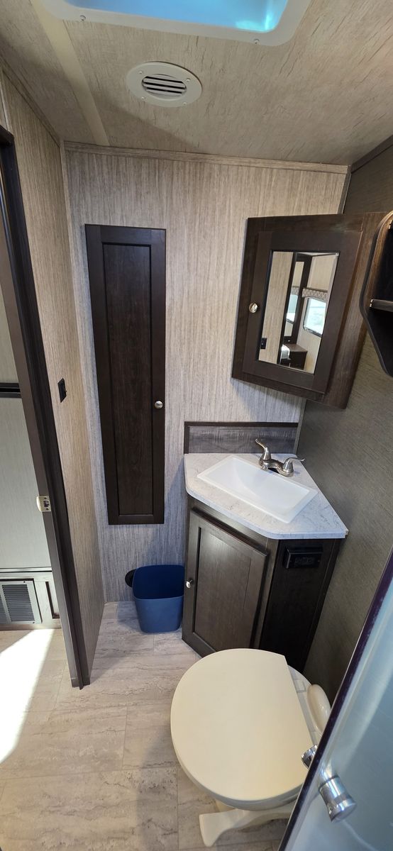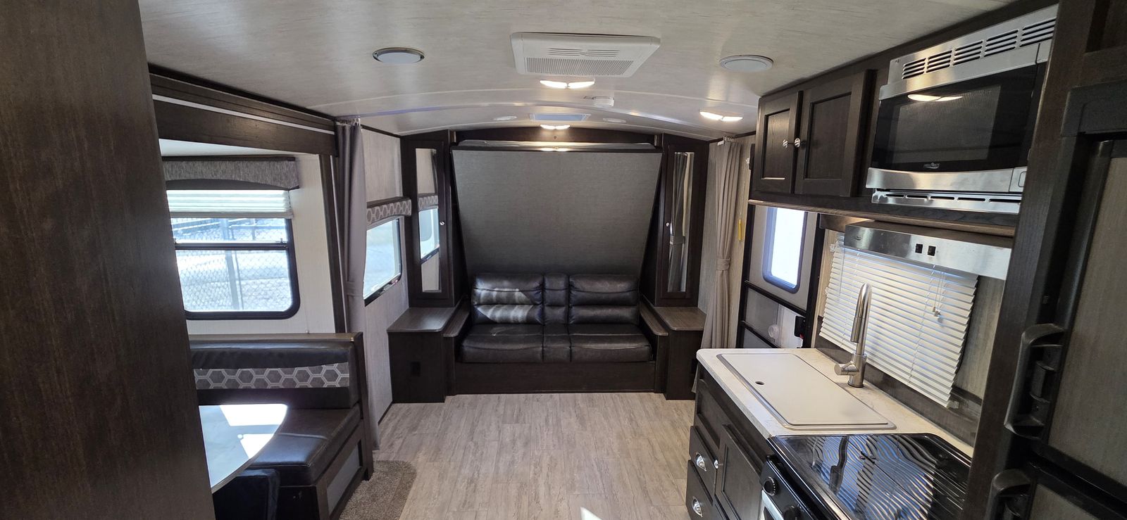 This is a highly desirable floorplan with the front Murphy bed, giving you both a comfortable sleeping area and a full living space during the day. Lightweight and easy to tow with most half-ton trucks and SUVs.