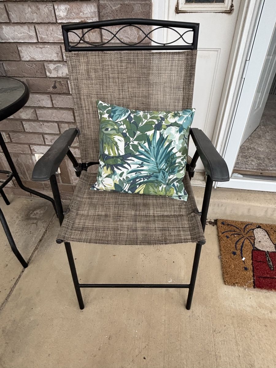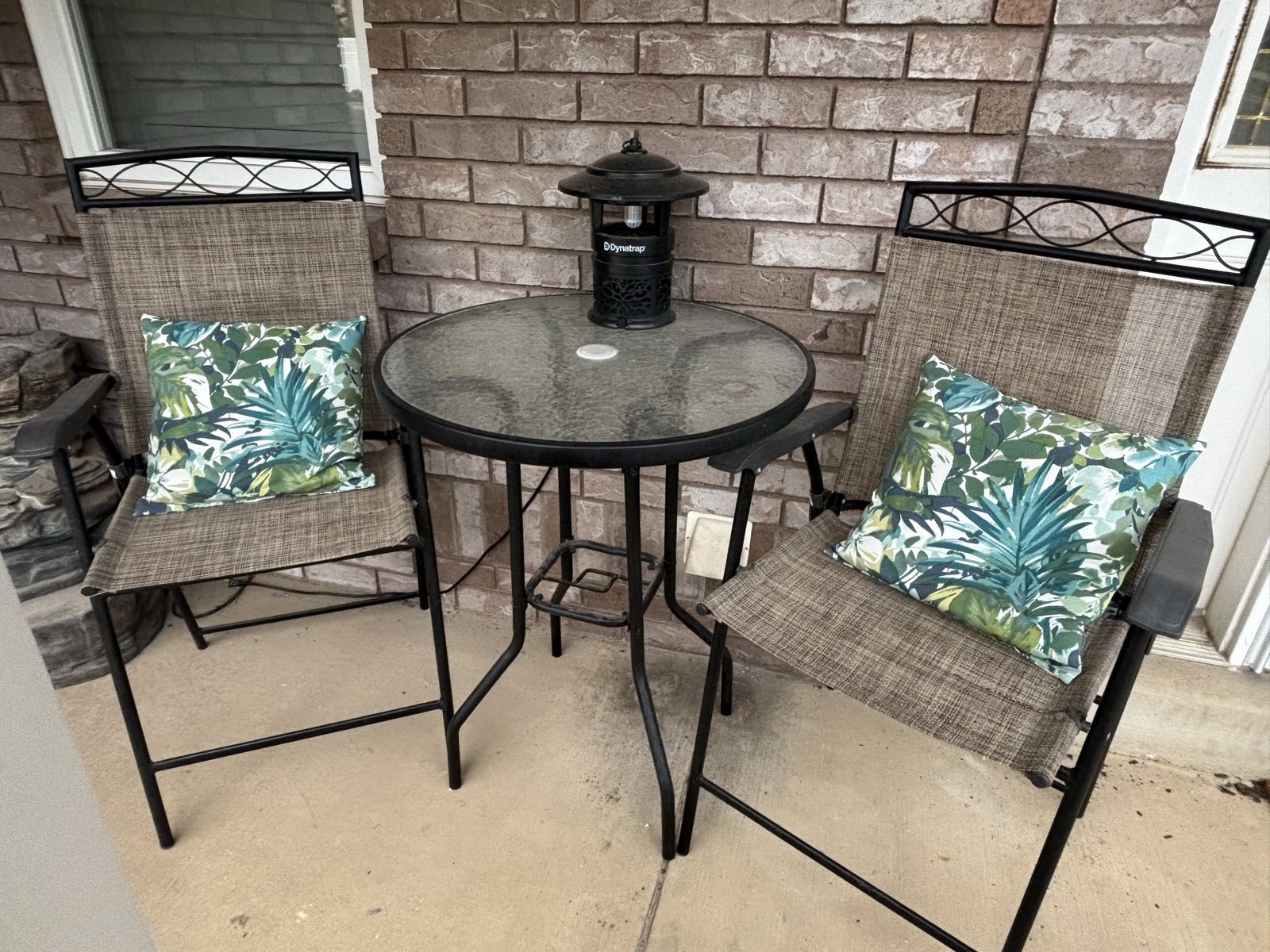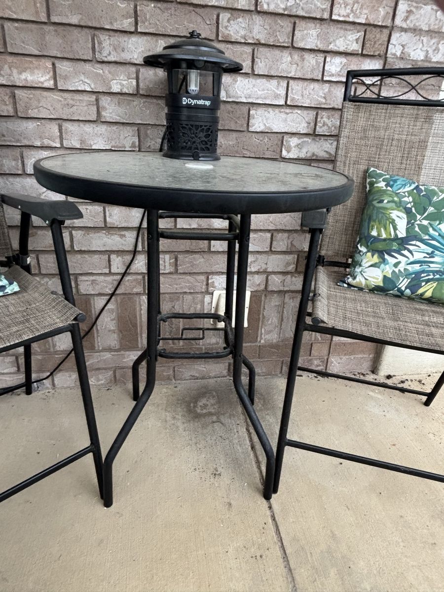 VenmoTwo bar height (23”) chairs with a bar top height (35”) table. Center opening and bracket for an umbrella if desired. Chairs include two pillows.