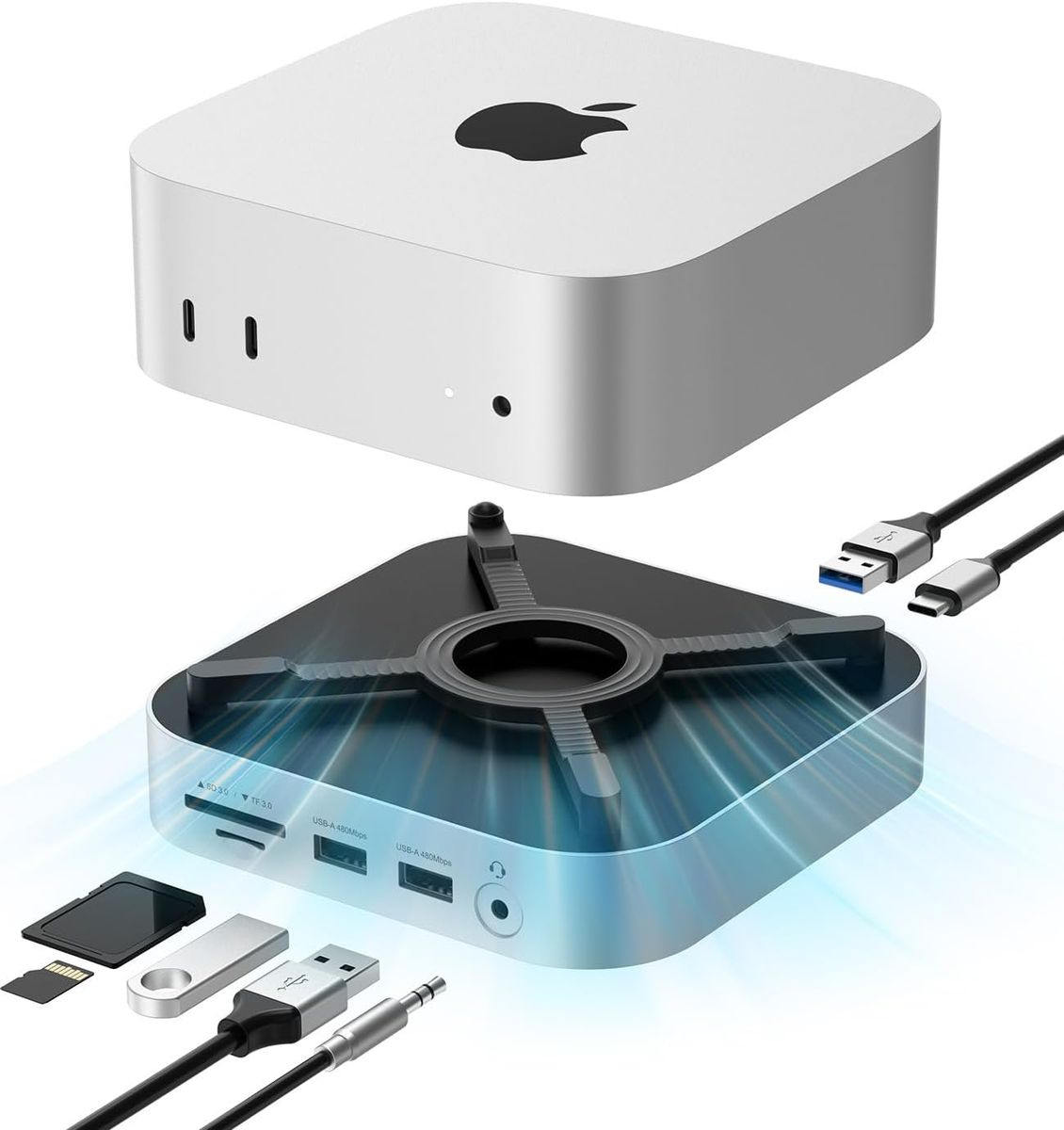 All-in-one mac mini docking station and mac mini hub with USB-C, USB-A, SD/TF, and audio ports, perfect for expanding m4 mac mini, mac mini m2, and similar devices into a powerful and organized workstation.