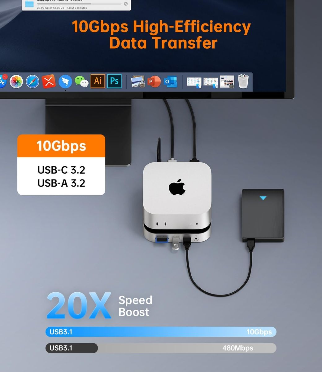 Experience ultra-fast 10Gbps data transfer with this m4 mac mini dock, ensuring stable and reliable connections for daily tasks like file transfers, editing, and multitasking without lag or interruptions.