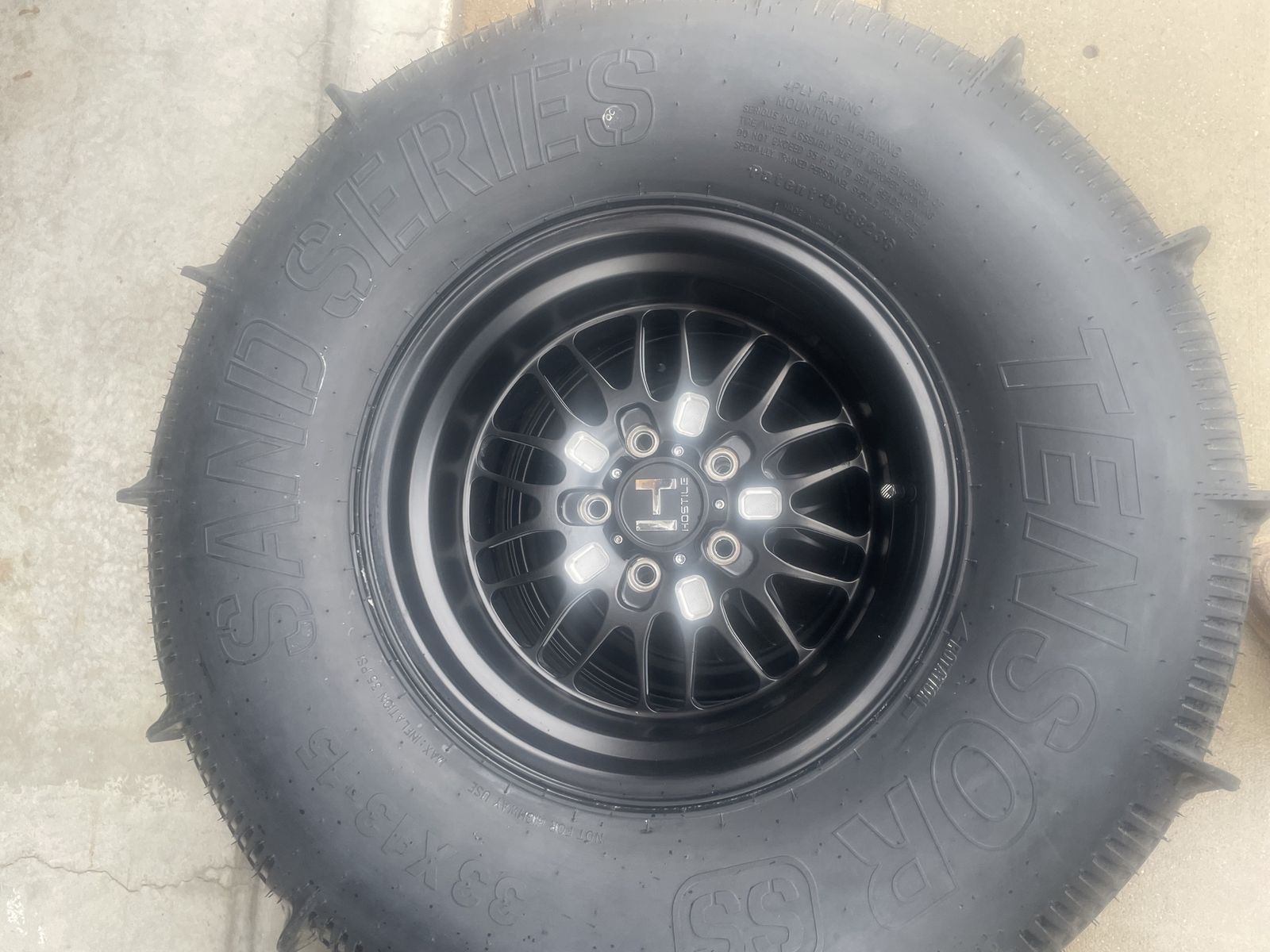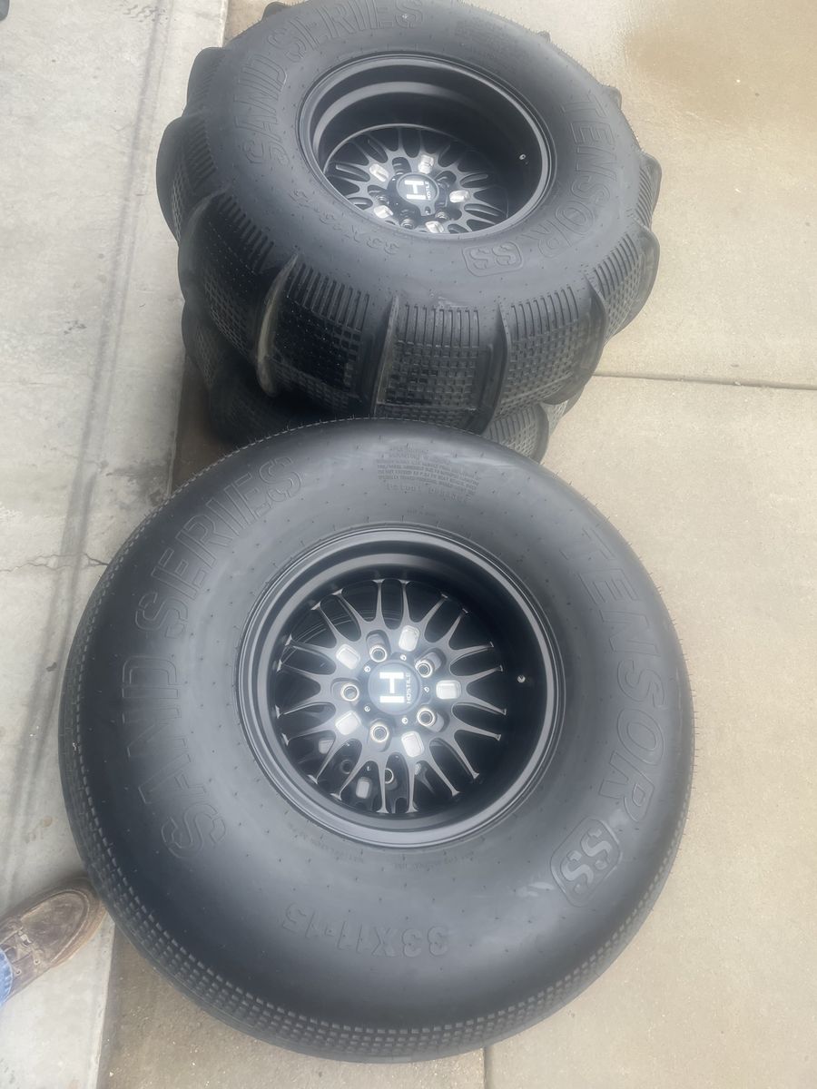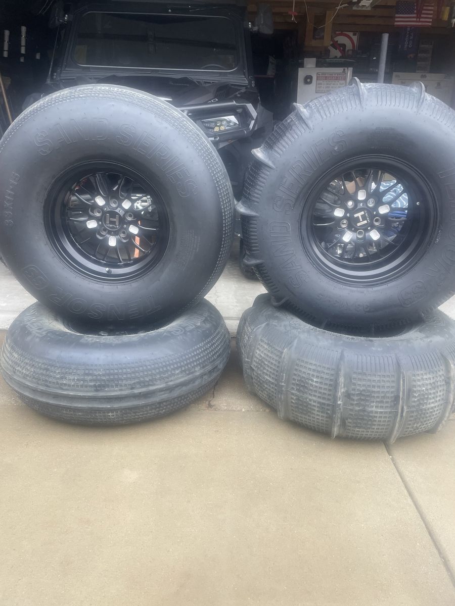 Hostile HF11 Boost forged aluminum wheels, (Rear )15x10 5-5 offset with Tensor 33x13x15 -14 paddle tires (Front) 15x8 5-3 offset with Tensor 33x11x15 SS front tires. 5x114.3 or 5x4.5 lug pattern fits newer RZR’s Have only been to sand 2 times, and are like new/used, Paid $2800 will take $2200 cash