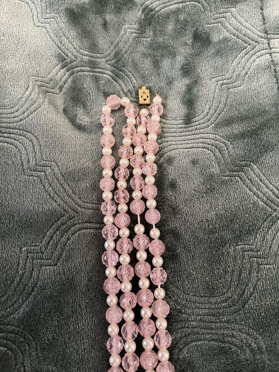 VenmoThis is a perfect necklace for someone who loves roses. It is very long. It measures 58 inches. The clasp is broken, but it could be fixed. That is why the price is so reasonable. Quite a fun find.