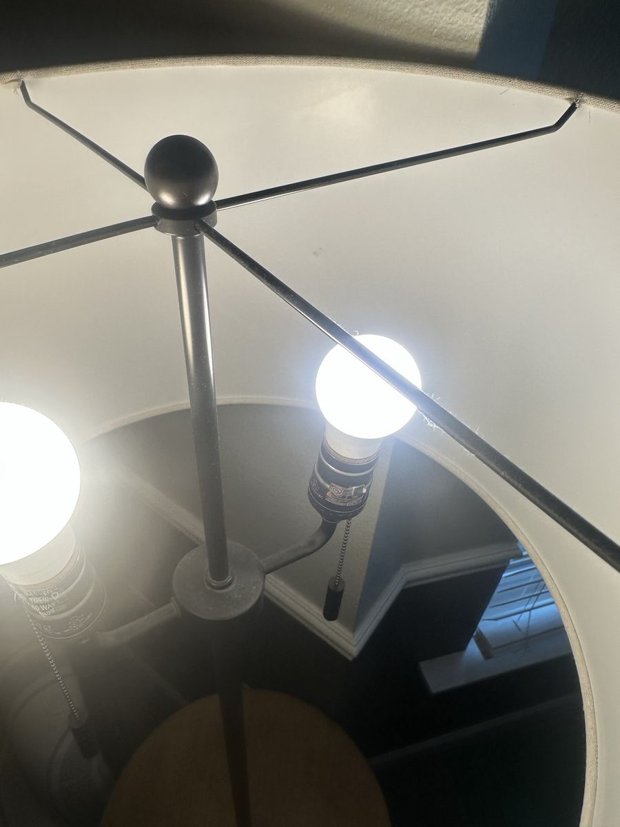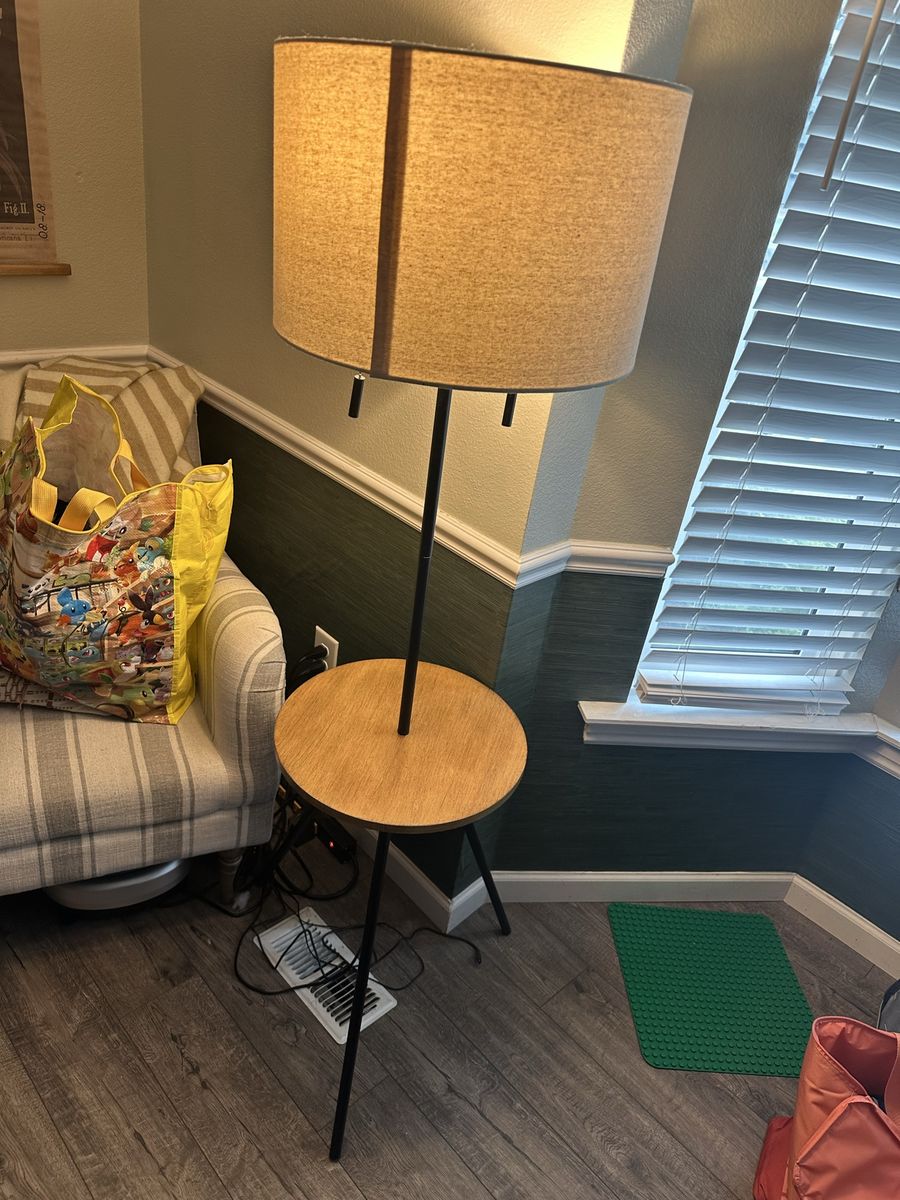 VenmoStylish mid-century modern tripod floor lamp with built-in wood side table. Perfect for a living room, bedroom, or reading corner.