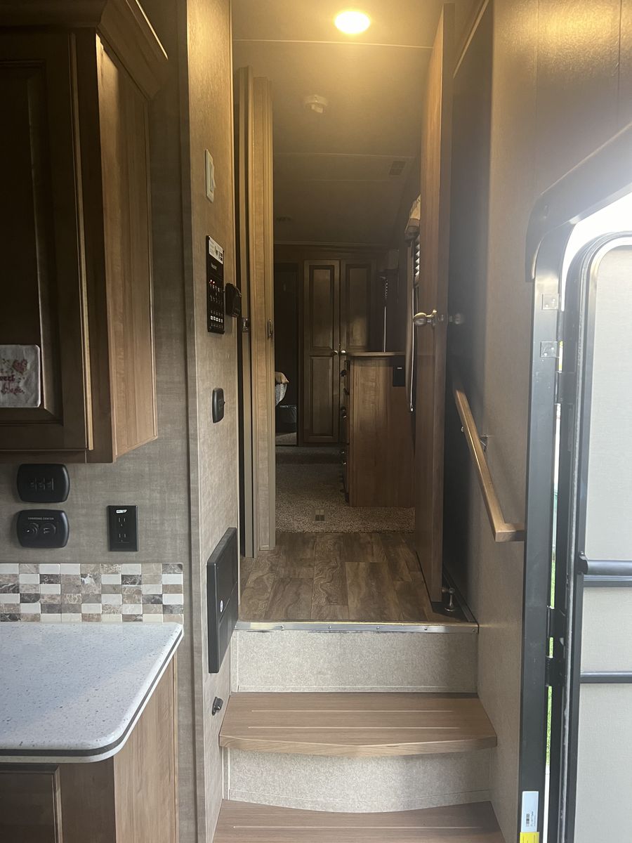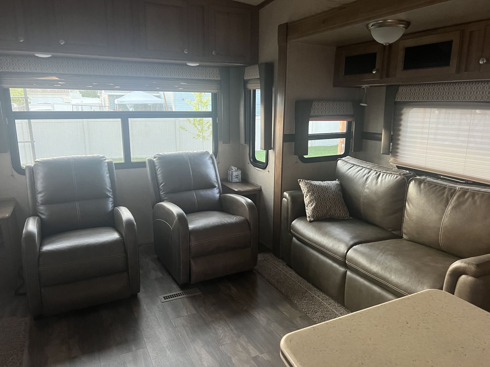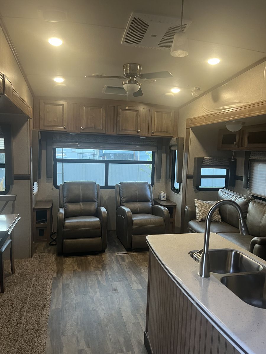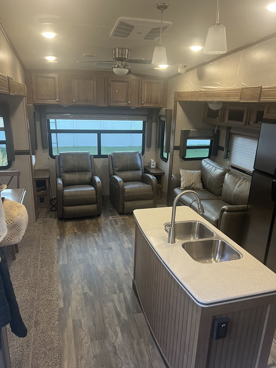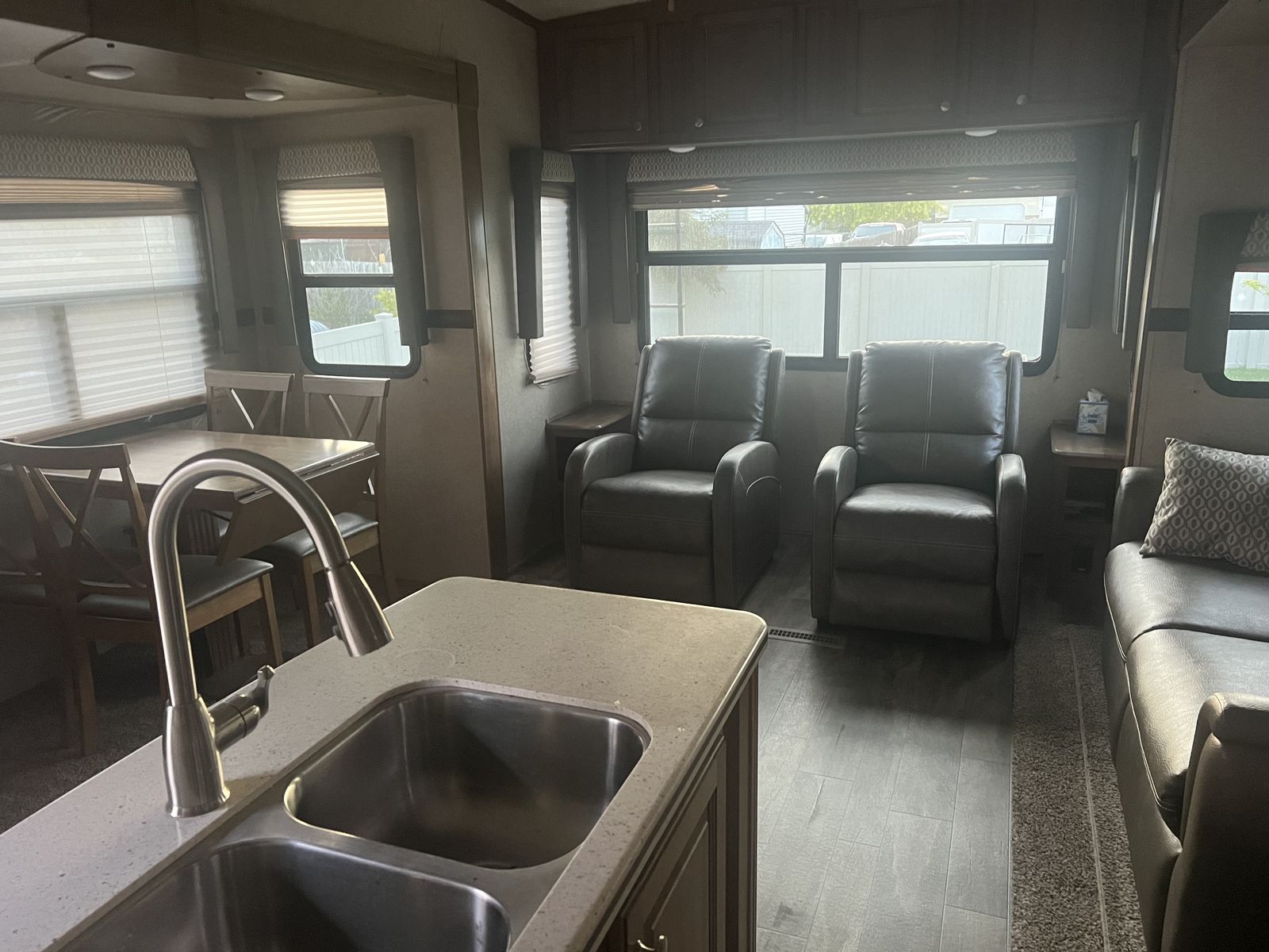 This model has one of the best layouts with a rear kitchen and large living space, making it feel much bigger than most fifth wheels in this size/weight class.