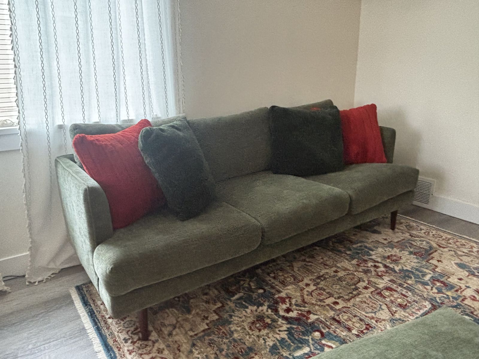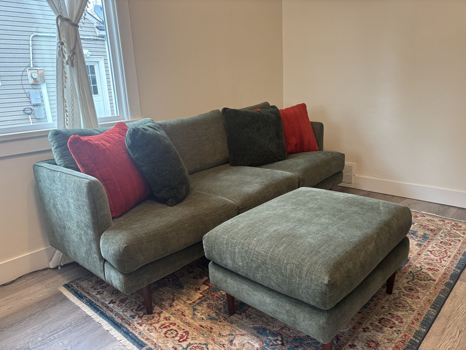 ZelleMid-century green fabric, 84" sofa with matching ottoman. The sofa and ottoman have hardwood legs. Non smoking and non children home. Price negotiable.