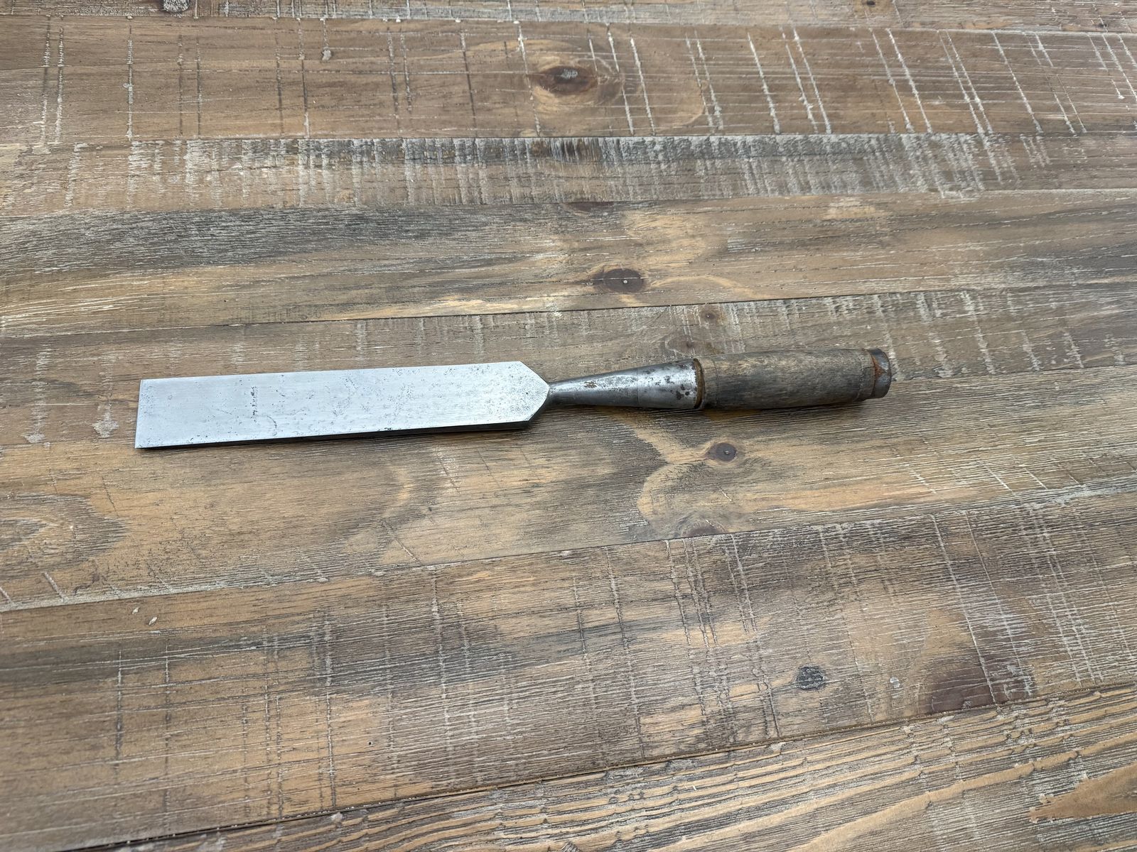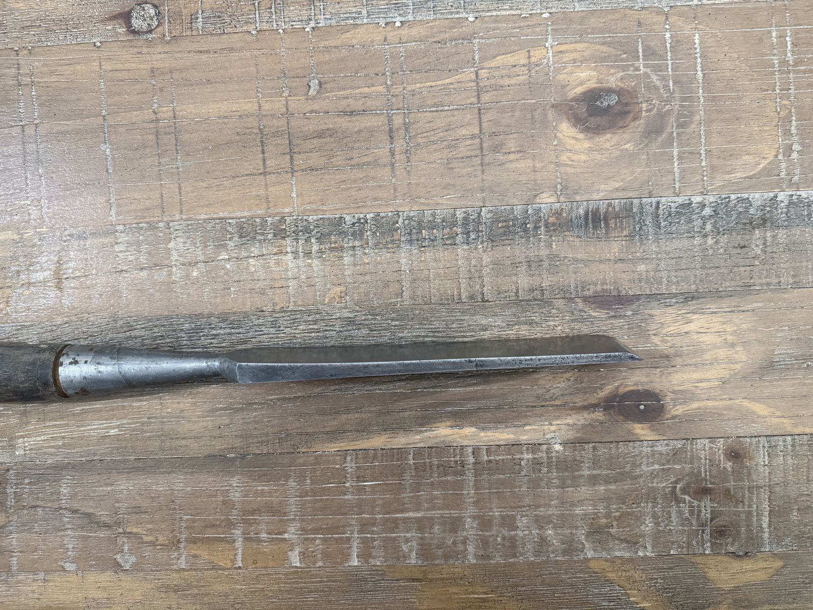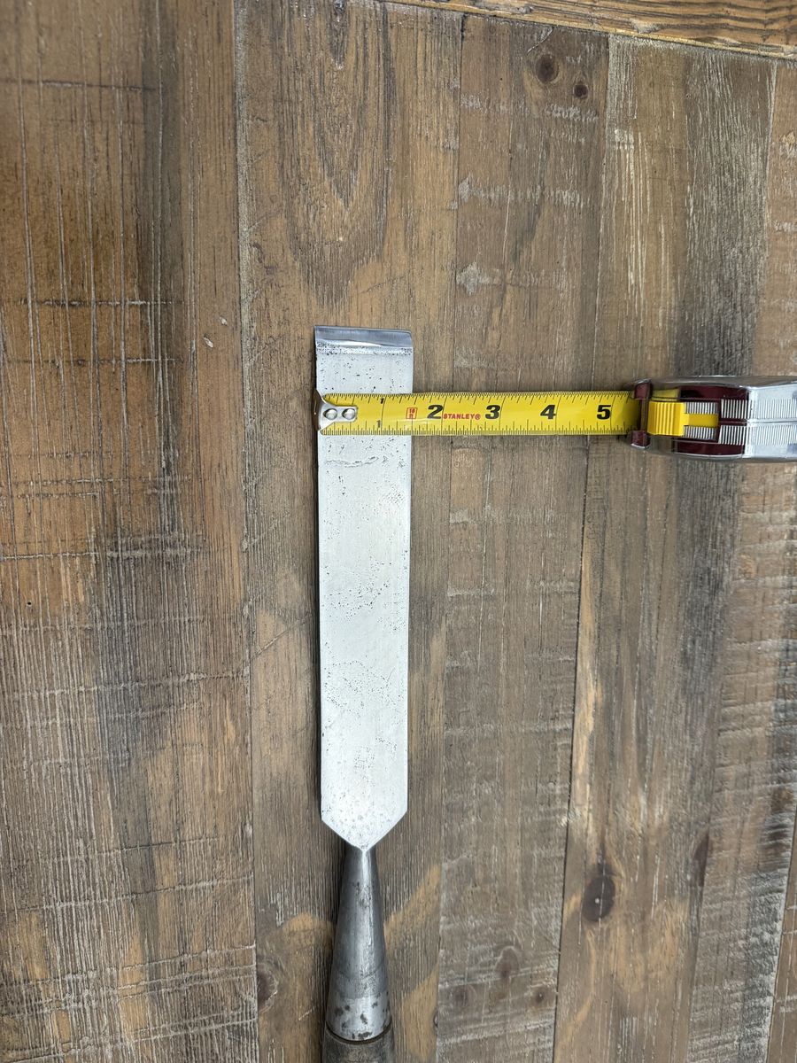 VenmoThis old mortising chisel or timber framing slick is 1 1/2" wide and more that 3/8" thick at the shoulder. It is a thick, heavy chisel made to chop out and pry deep sockets. It has some pitting but is fully functional. I have sharpened it to razor sharp.