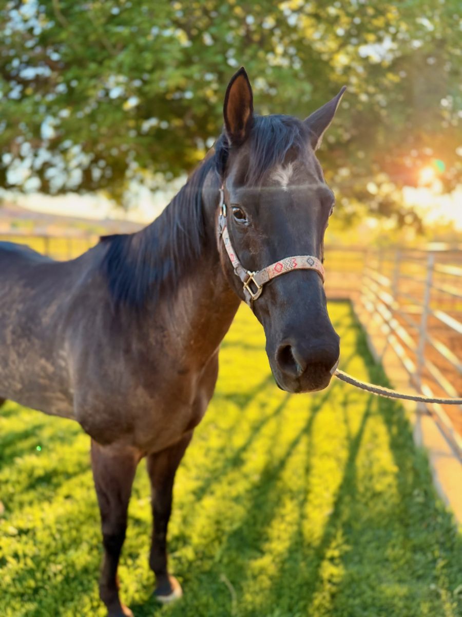She’s been exposed to traffic, tractors, and the general chaos of ranch life and takes it all in stride. She’s confident around other horses, navigates obstacles like bridges and gates without hesitation, and handles new environments with a calm, willing attitude.