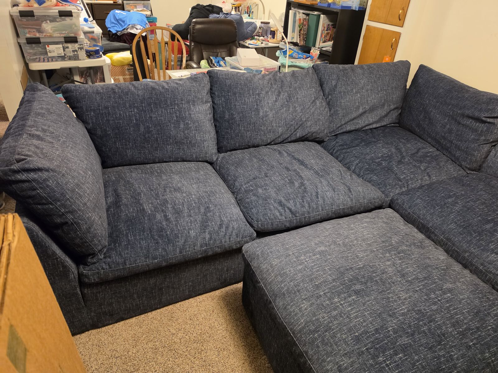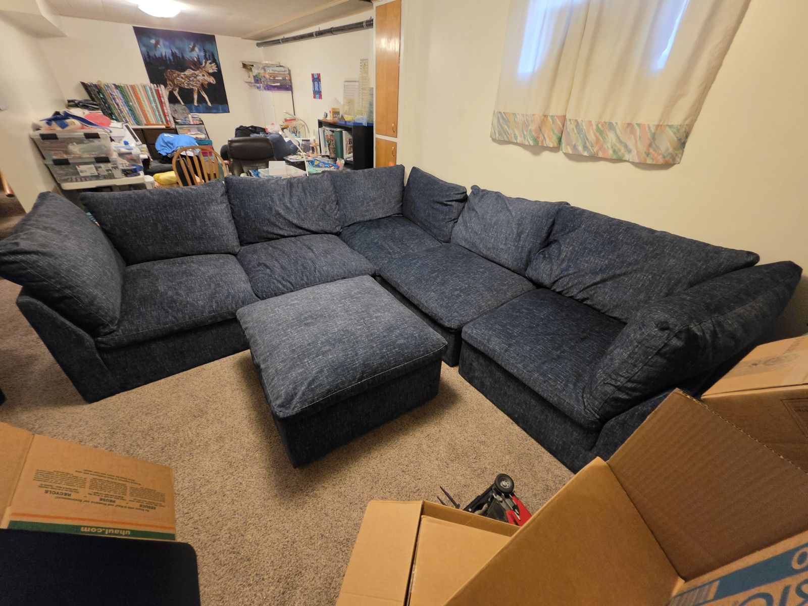 Large sectional sofa in excellent condition. The sofa has 5 sections - 2 end pieces, 1 corner piece, and 2 mid-sections, plus an ottoman. The sections all come apart individually so it can be arranged in a variety of ways. It was purchased after all the kids left home, so the use has been minimal. We are moving and do not need this sofa. The 2 end pieces are approximately 38"x38" forming the L shape. The corner section is also approximately 38"x38". The 2 mid sections are approximately 33"-34" wide. All sections are 34" deep. The back of the sofa is 26 1/2" high without the cushions and 37" high with the cushions. We're asking $325 or best offer. You will need to be able to pick the sofa up as we have no way of delivering it.