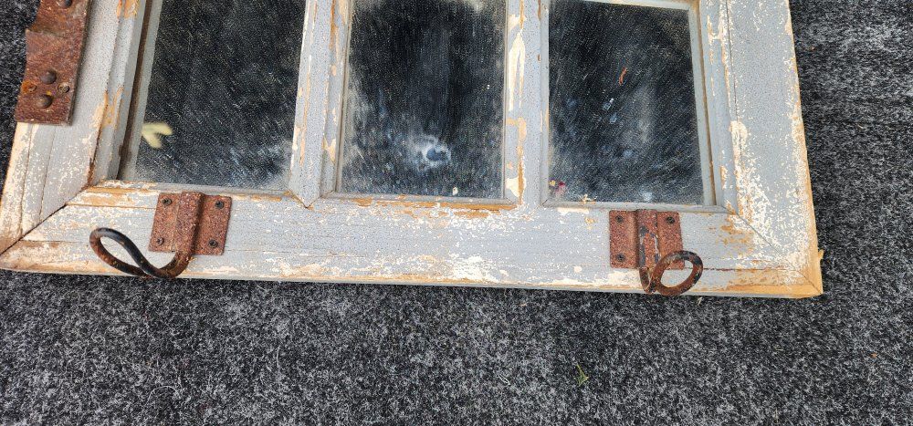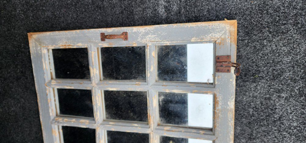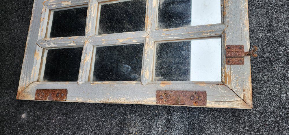 nice old vintage window frame with mirrors. has rusty metal hinges and hooks. pick up in Layton. No holds or deliveries.