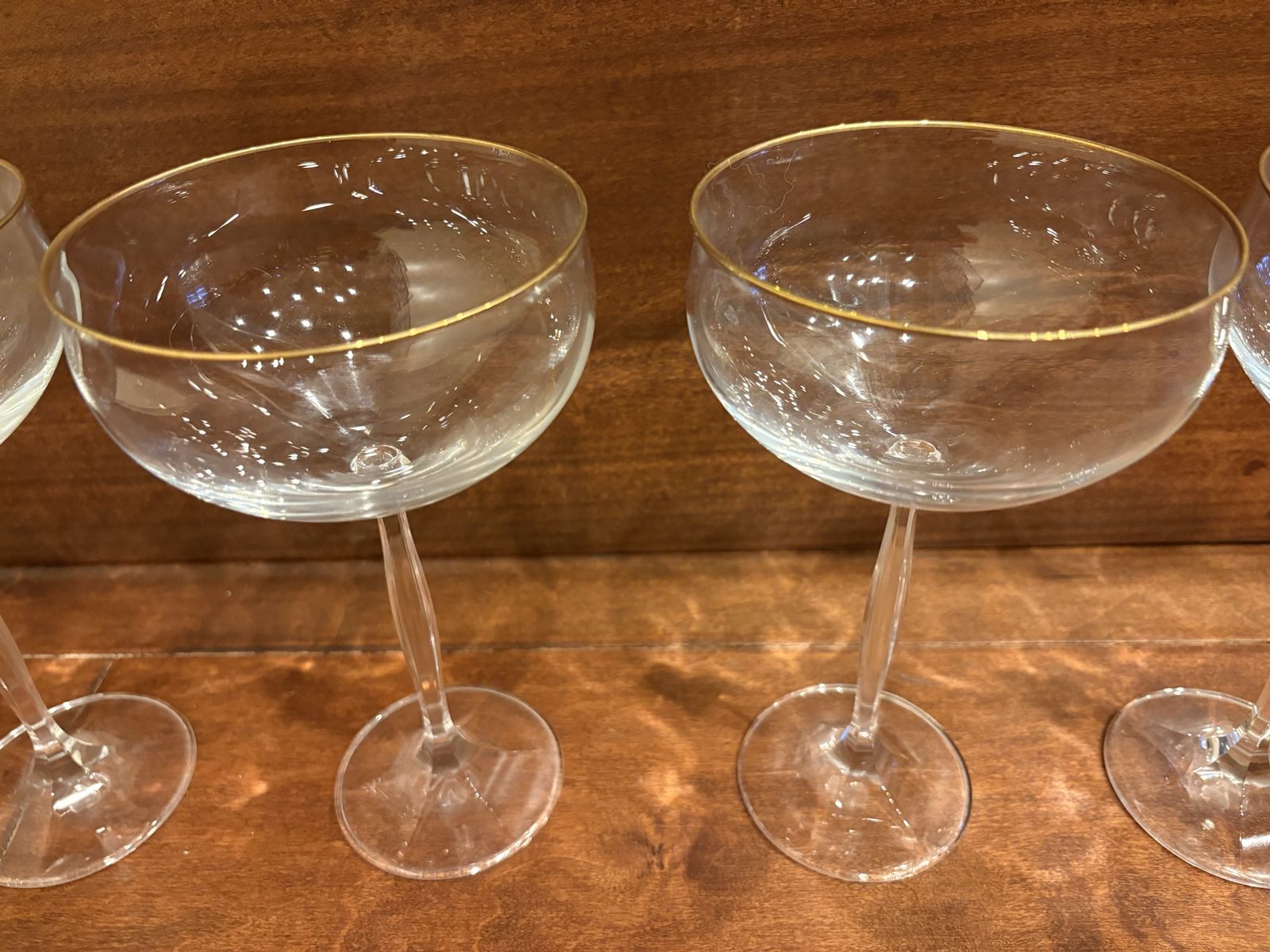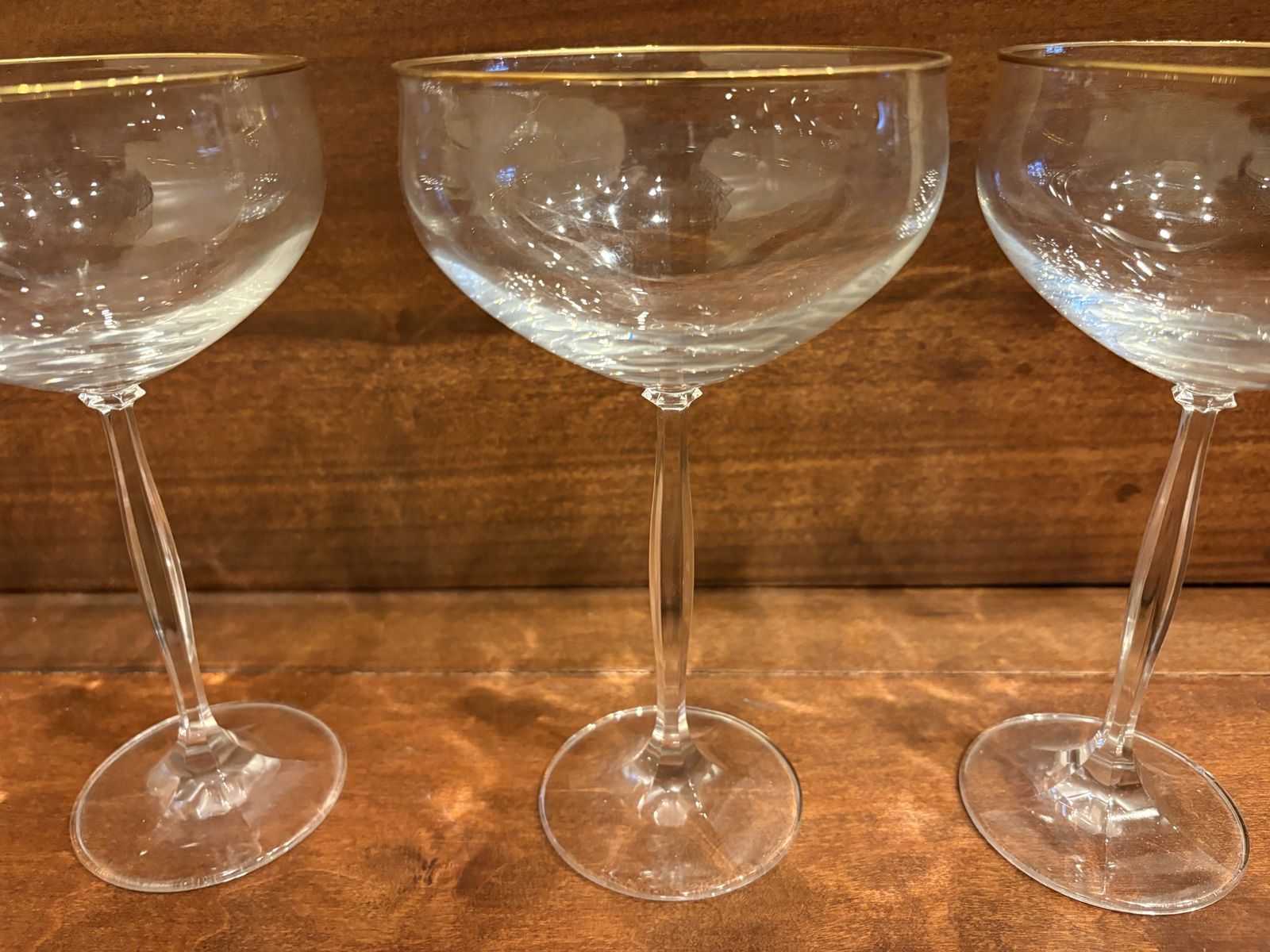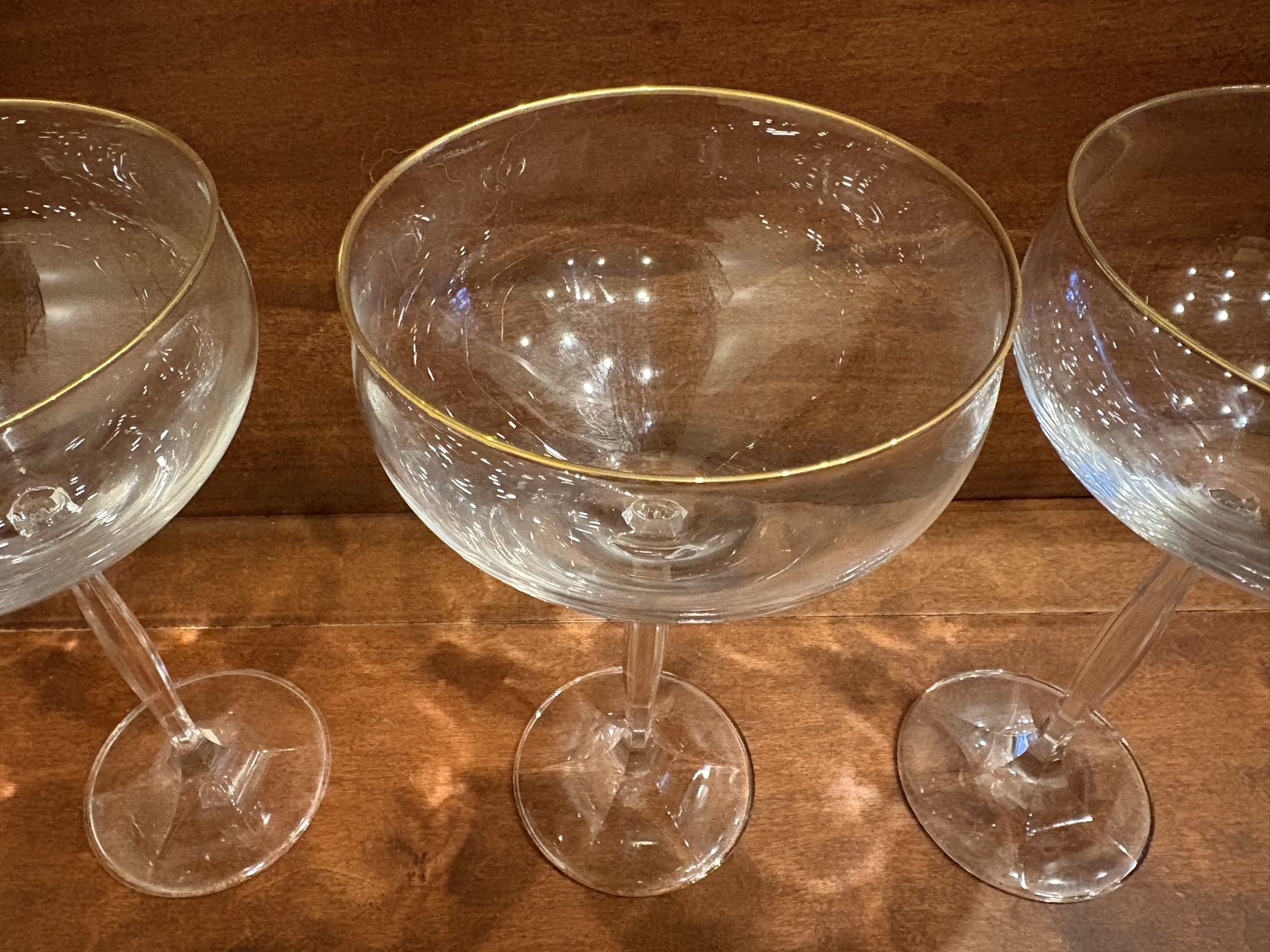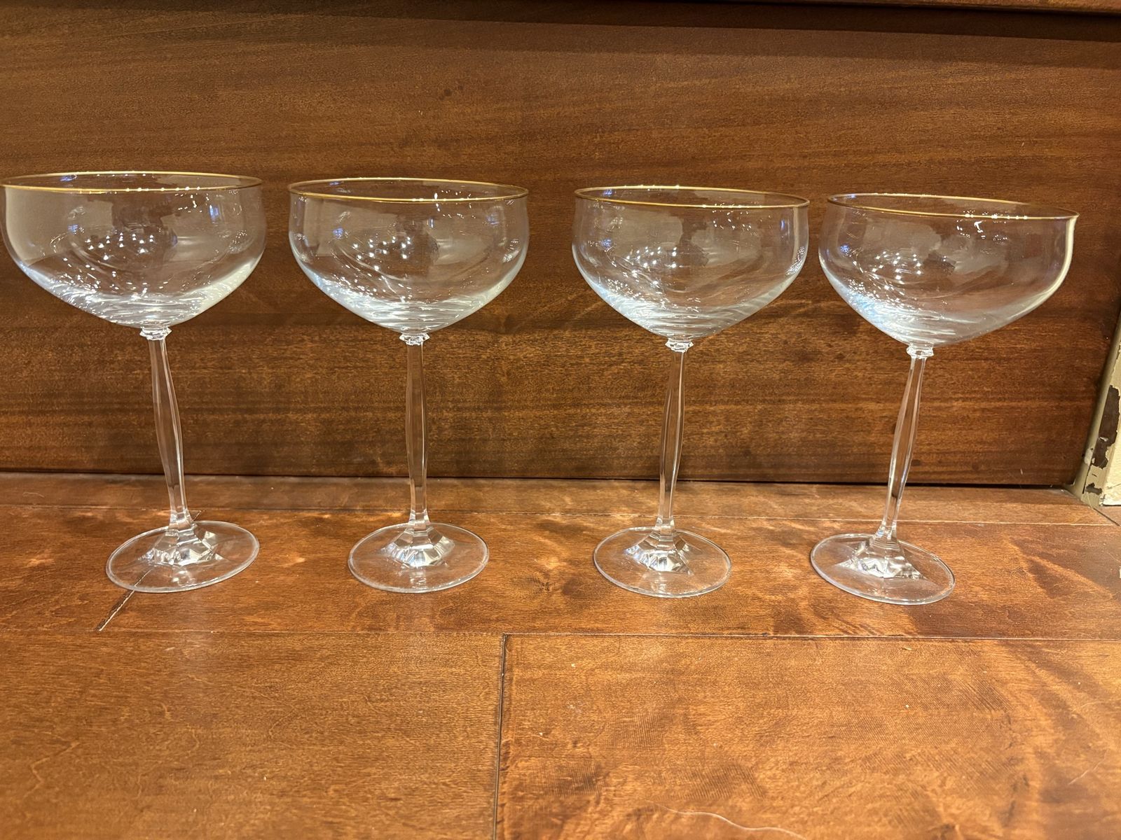 I have 4 beautiful stemware glasses with gold around the rims. They are 7 3/4 inches tall and 4 1/4 inches across. The price is for all of them together. See my other ads for jewelry, artwork, home decor and more.