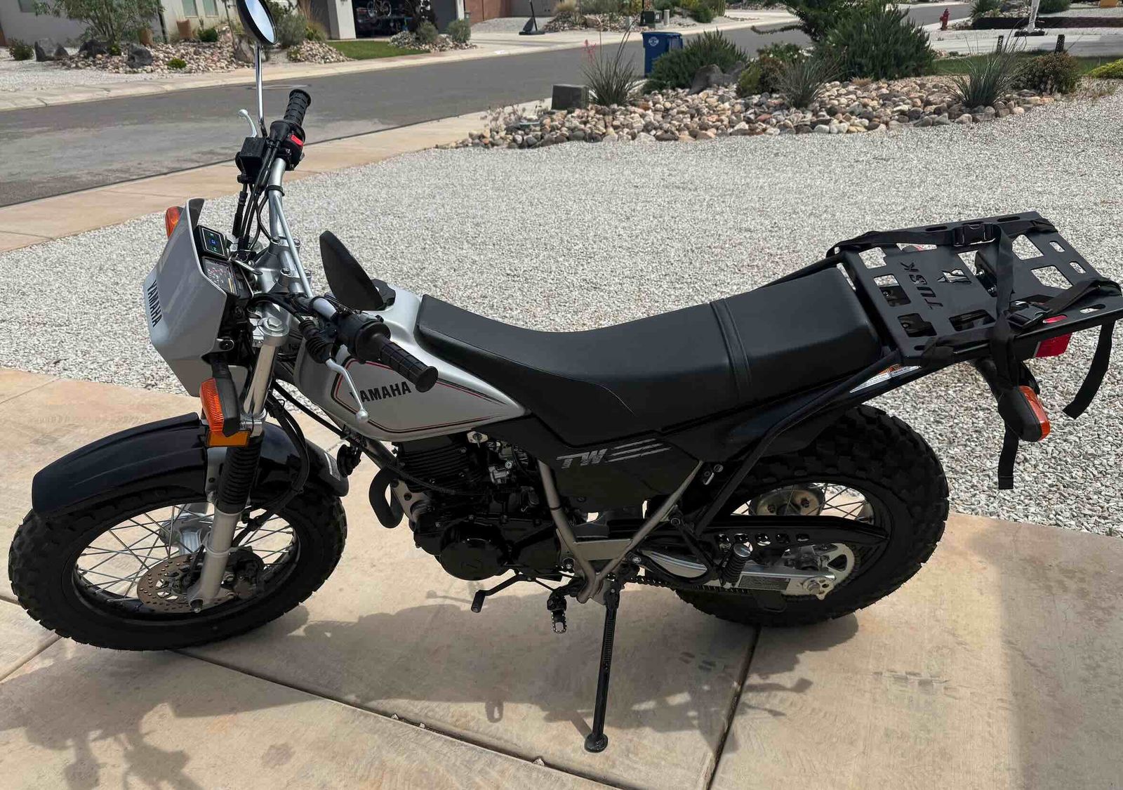 Only 165 miles. This is basically new and in new condition. Fully street legal. I bought it just before we moved to St. George and I'm getting older and decided it's time to stick to 4 wheels. The TW200 lists at most dealers for 4999 PLUS 400 destination charge and another 600 or so for dock fees or floor fees. Out the door you would be into it over 6000. It includes a rear storage rack with straps and a heavy duty cargo bag, worth an additional $100. Bike is in St. George.