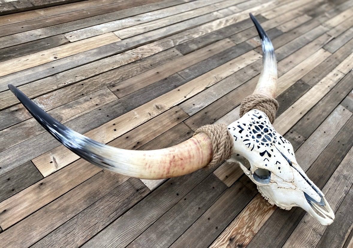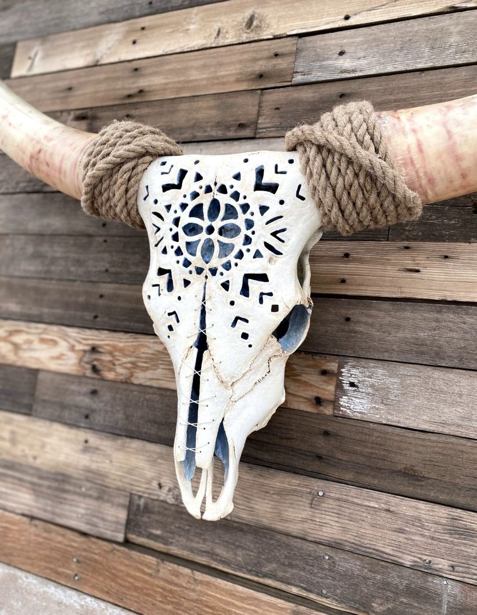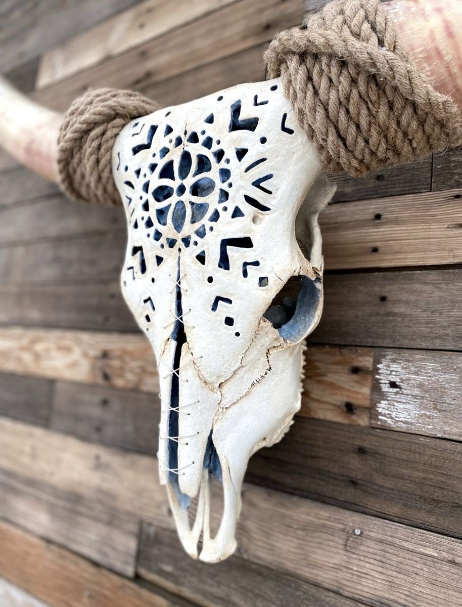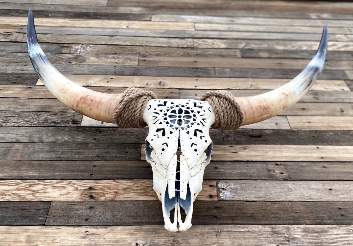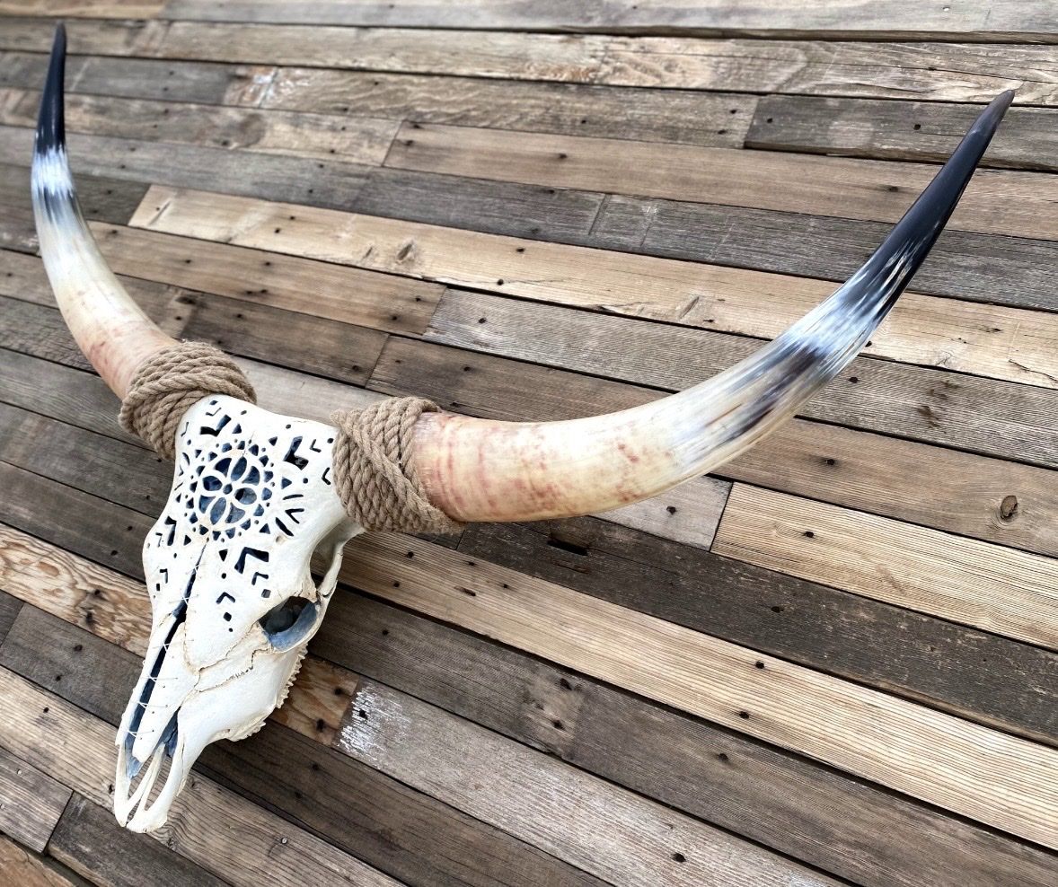 VenmoThis beautiful genuine longhorn measures 48” tip to tip. Its hand carved design was done by me. The inside is painted a soft blue, the skull white and has wire lacing. No trades or scams.