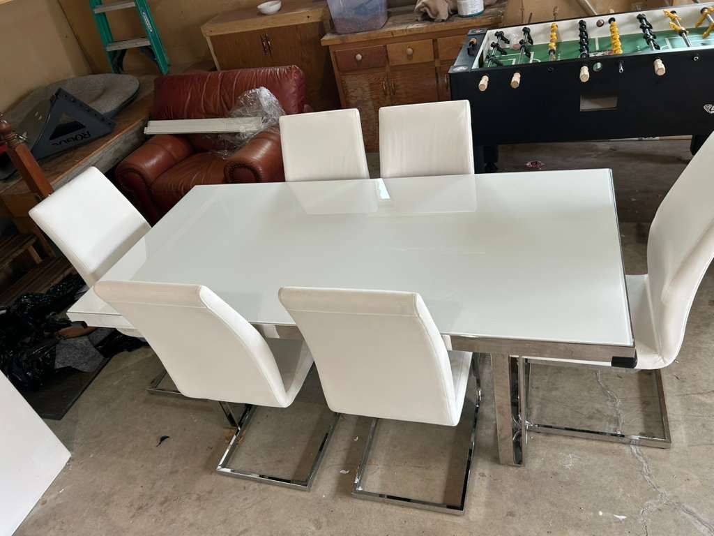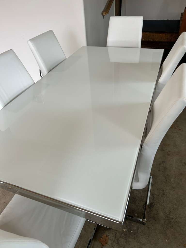 Includes: Glass dining table + 6 matching chairs Condition: Excellent (no cracks, no stains, very well kept) Style: Modern / contemporary Seats: 6 people comfortably Color: White + glass top