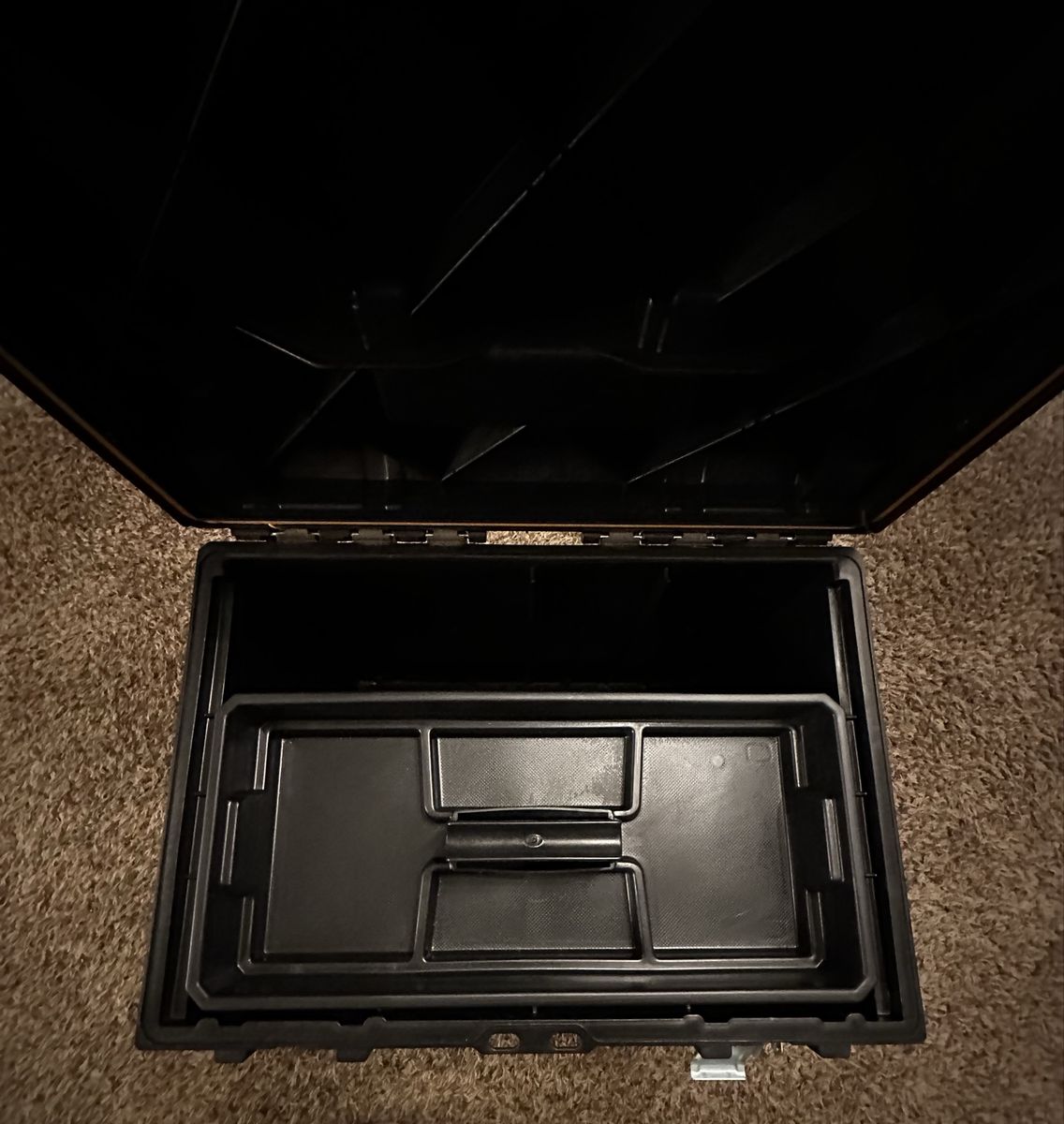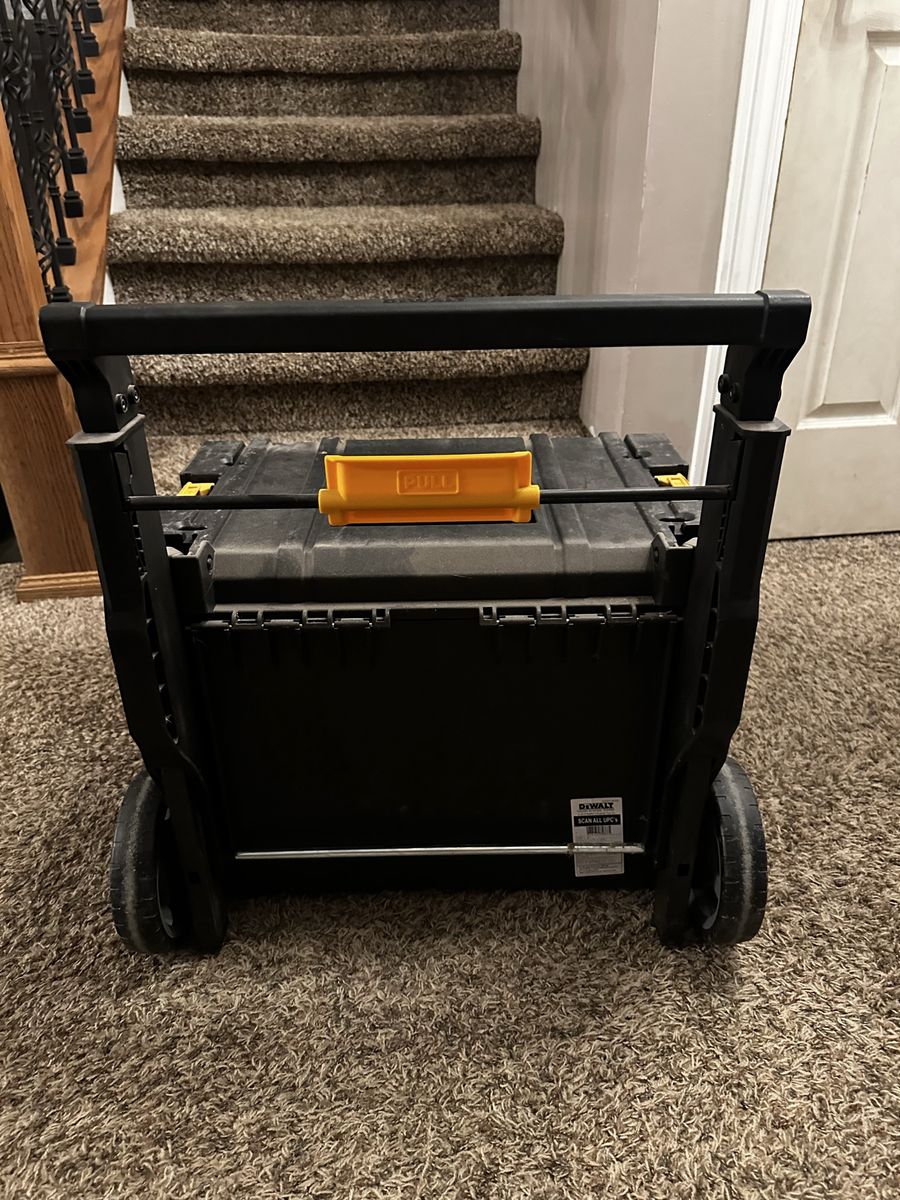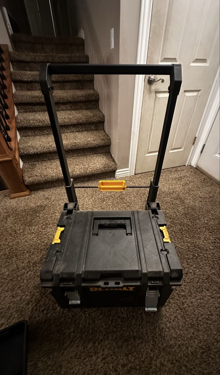 Dewalt Rolling tool box with an extension handle. Toughsystem latches to add more dewalt accessories on top.