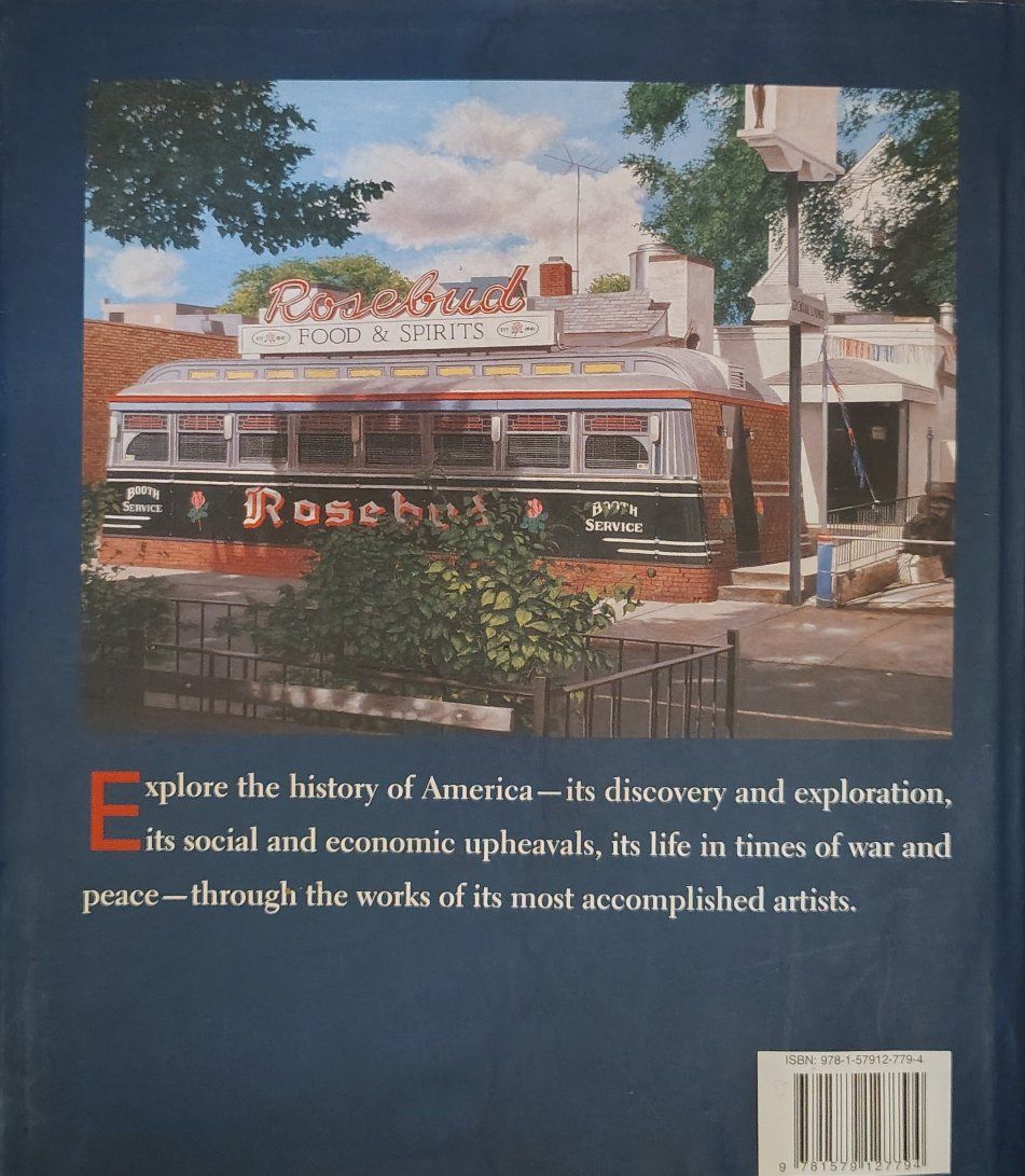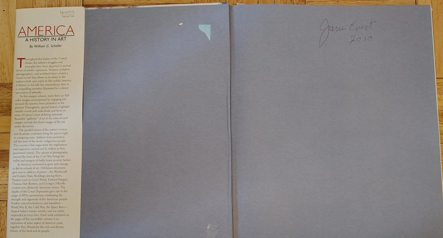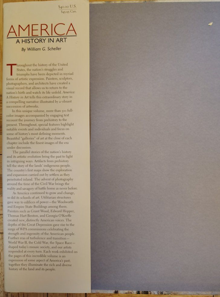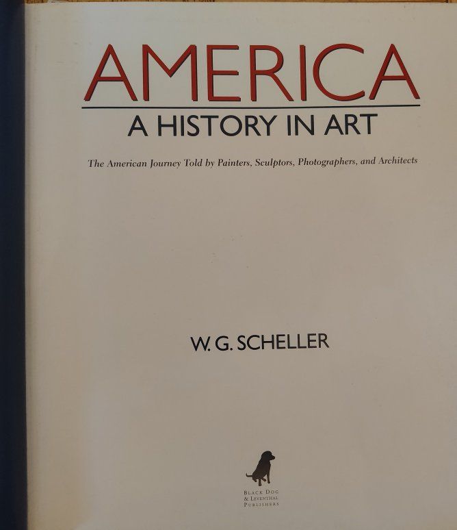 America: A History in Art by William G. Scheller. The book presents a visual history of the United States from pre-Columbus times to the present day. It features over 300 full-color images of artworks, including paintings, sculptures, photographs, and architectural designs. Renowned artists highlighted in the book include Ansel Adams, Edward Hopper, Georgia O'Keeffe, and others. It was published by Black Dog & Leventhal in 2008.