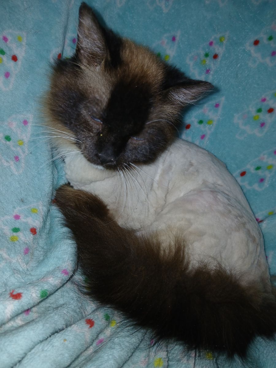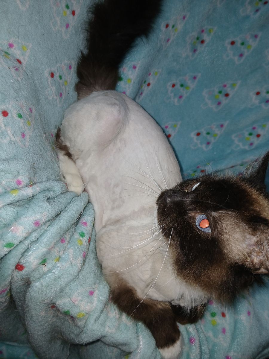 Cham is an amazing cat that went from rags to riches. She lived on the street for 3 years but now lives inside a cozy house. Still getting used to the sound of a vacuum but doing better. Litter boxed trained. Great around other cats. Terrified of dogs. Extremely affectionate- loves to roll all over the ground for belly rubs. Himalayan 3-4 years old. Had to be sedated/ shaved to remove the matts all over her body. Looking for a home with another FIV cat or as an only pet. She will steal your heart ️ !!