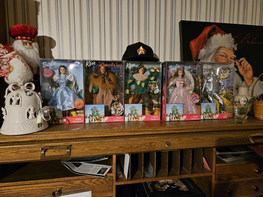 VenmoVintage Wizard of Oz Barbie and Ken Dolls Set of 5 New in Box: ..Barbie as Dorothy The Wizard of Oz with Toto. Ruby slippers light up and Dorothy Talks "There's no place like home." and "Toto, I have a feeling we're not in Kansas anymore." ..Ken as Cowardly Lion ..Ken as Scarecrow ..Barbie as Glinda - Talks "Tap your feet together..." And Hear the magic wand "Brrrianng." ..Ken as Tin Man