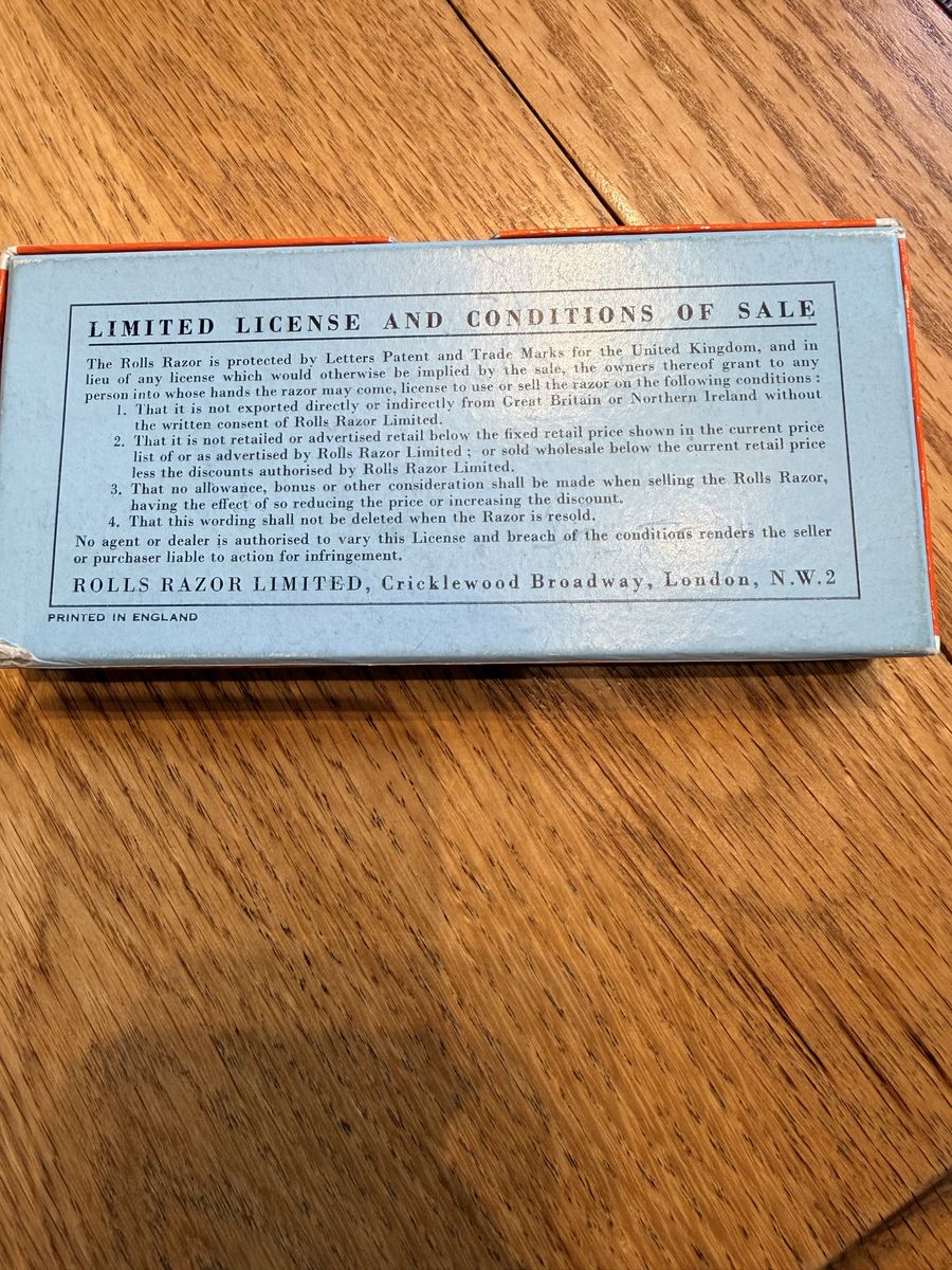 This is a vintage Rolls Razor Imperial No. 2, a collectible wet shaving kit manufactured by Rolls Razor Ltd, London. Popular during the 1930s and it was often issued to British soldiers. Components includes a safety razor handle, a Sheffield steel blade, a honing stone, and a leather strop, all enclosed in a metal case housed within this cardboard box. The kit allows the user to sharpen the blade by moving it back and forth within the case, using the integrated hone and strop.