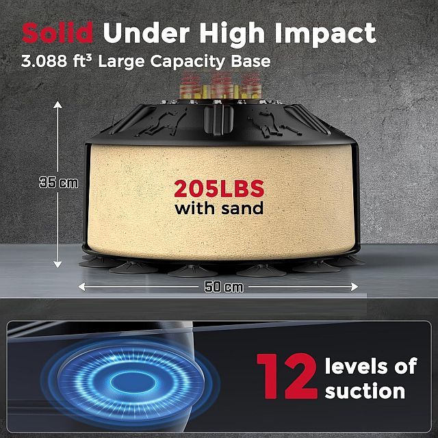 Super stable 5mm ABS base with 12 strong suction cups – fills with sand up to 205 lbs