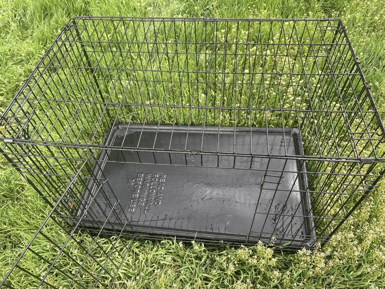 VenmoIncludes removable plastic tray. Folds flat for easy storage and transport. No damage, all latches work perfectly. Great for dogs 40–70 lbs. Nice size that accomidates most dogs.
