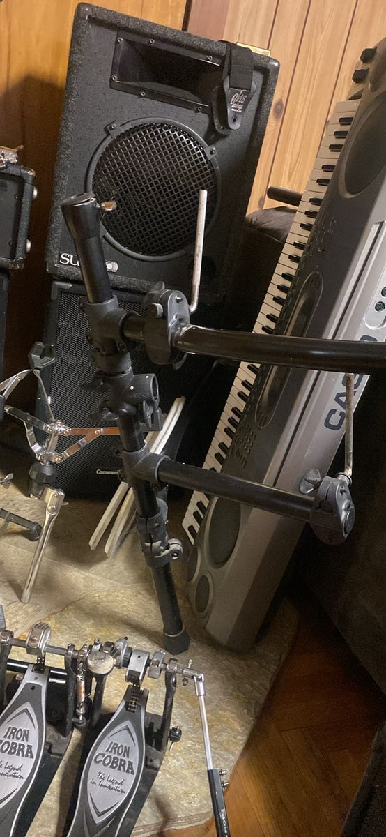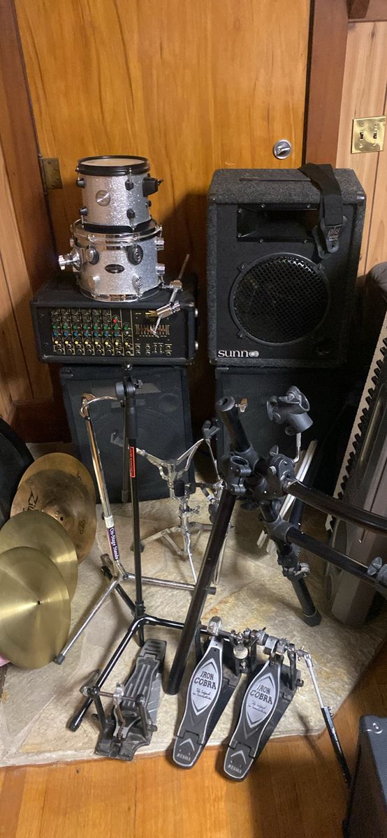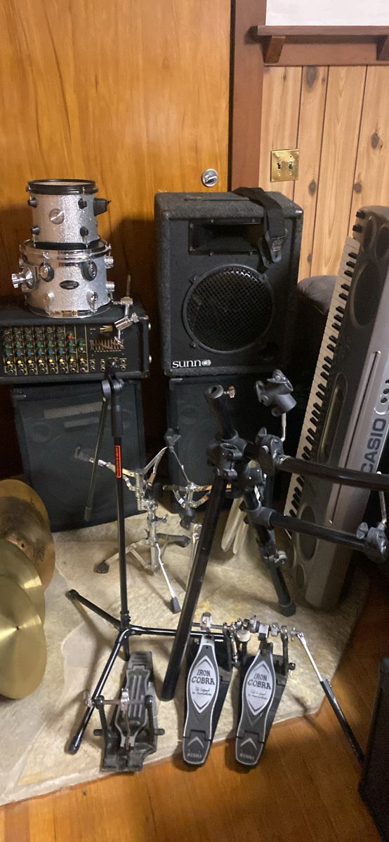 350 takes all. Iron cobra 900 is good for parts or a project. It is missing half the drive shaft and some other components. The amp works. Keyboard runs on D batteries, no power supply. Zildjians 14" ZBT hi hats, no cracks or keyholes, no name hi hats. Tama Snare stands. PDP CX maple 10x8 mapex 8" Sunn speaker cab has no driver but horn works and wiring is good to plug and play with new driver. 12". Mic stand wobbly but works, one community speaker is bummed but horn works and the other works fine. Electronic drum rack with several clamps. Would love for somebody to take it all. I need it gone stat. Thanks a million!