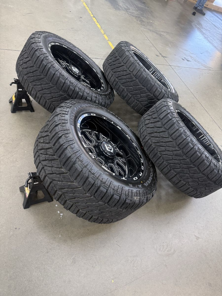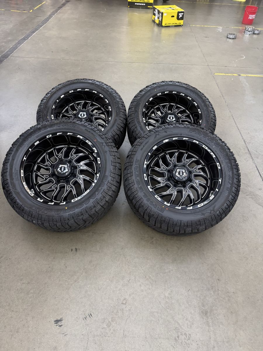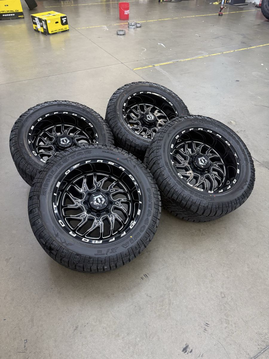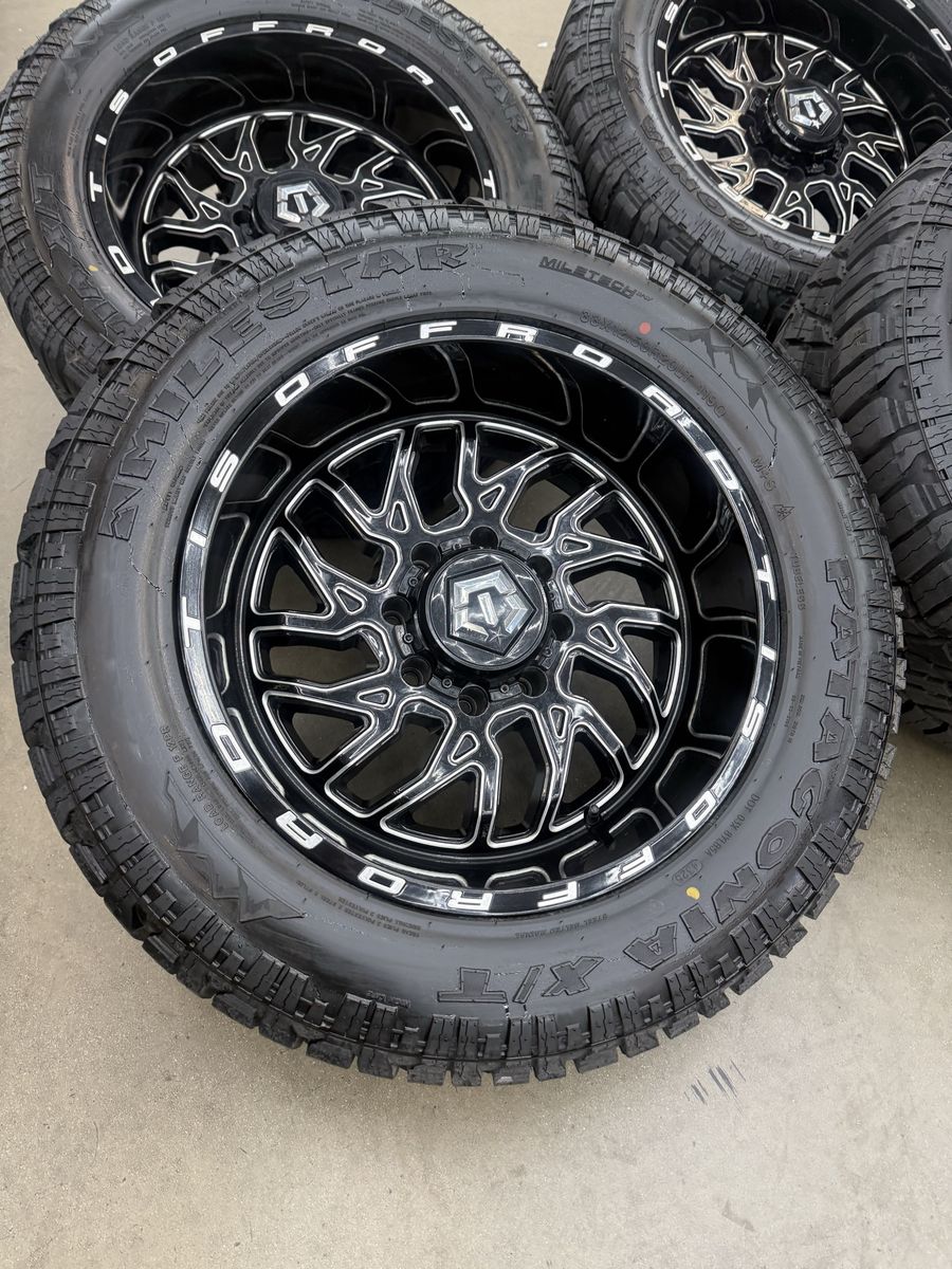 Wheels are 20x10 tis offroad, “544”, -24 offset, top of the line wheels. Wheels are in like new shape, no curb rash, dings or major damage on them, all of the center caps are also included and in perfect shape. Wheels alone are over $2,000 new. Tires are 33x12.50r20 Patagonia x/t, load range F, 12ply, top of the line tires. No patches or plugs on them, very very quiet tires, less then 1k miles on them, so they are in like new shape.