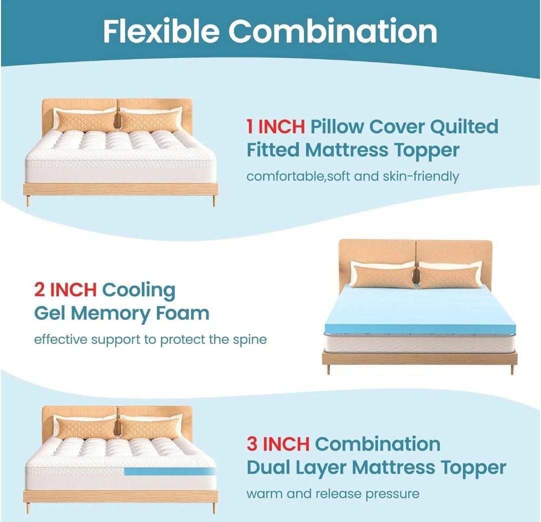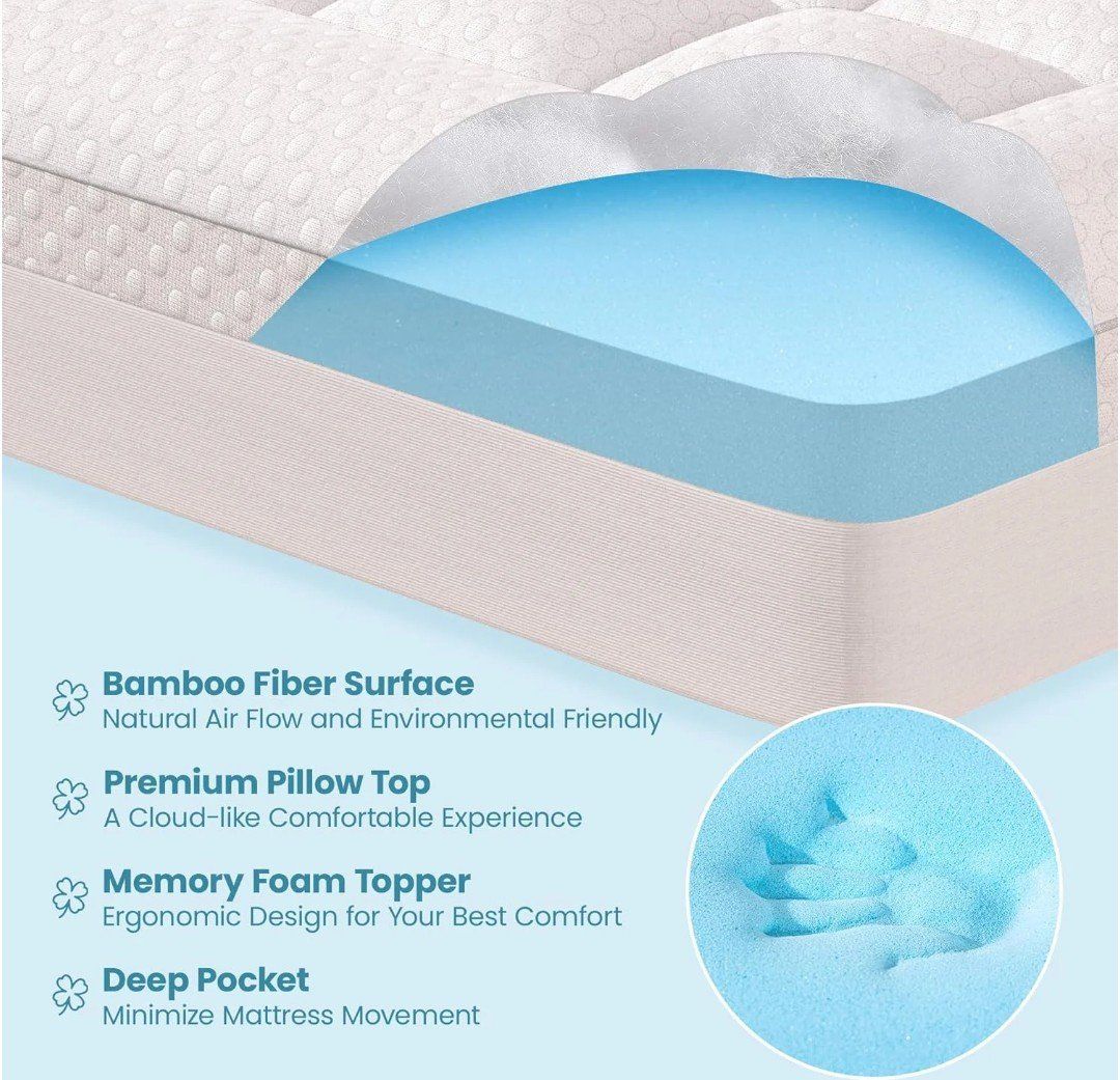 Features: • 3” dual-layer design (1” quilted pillow top + 2” cooling gel memory foam) • Soft, breathable bamboo fiber surface • Deep pocket fitted skirt (fits mattresses approx. 8”–21”) • Helps relieve pressure points and support your spine • Stays in place with 360° elastic skirt • Great for firm mattresses or upgrading guest beds