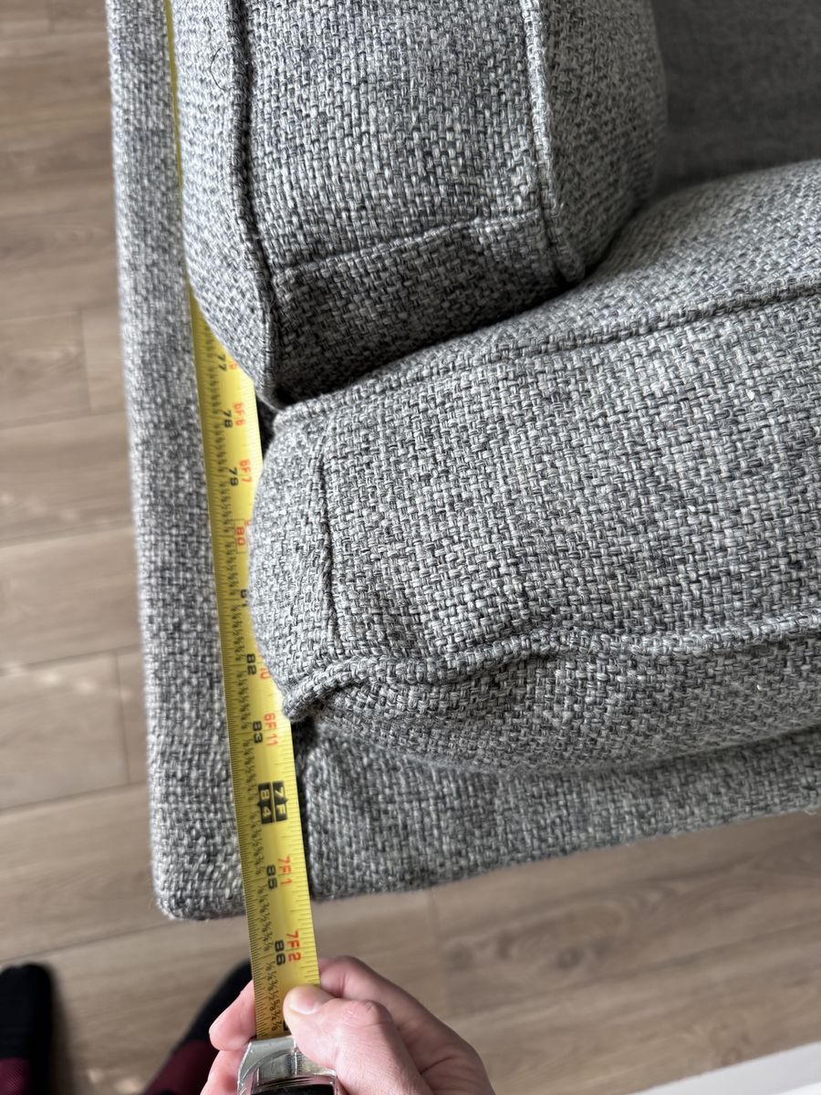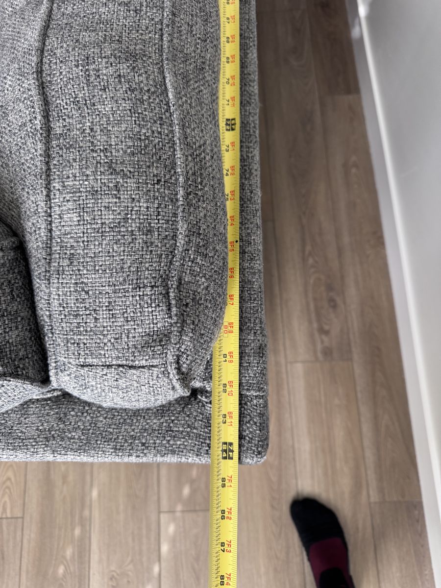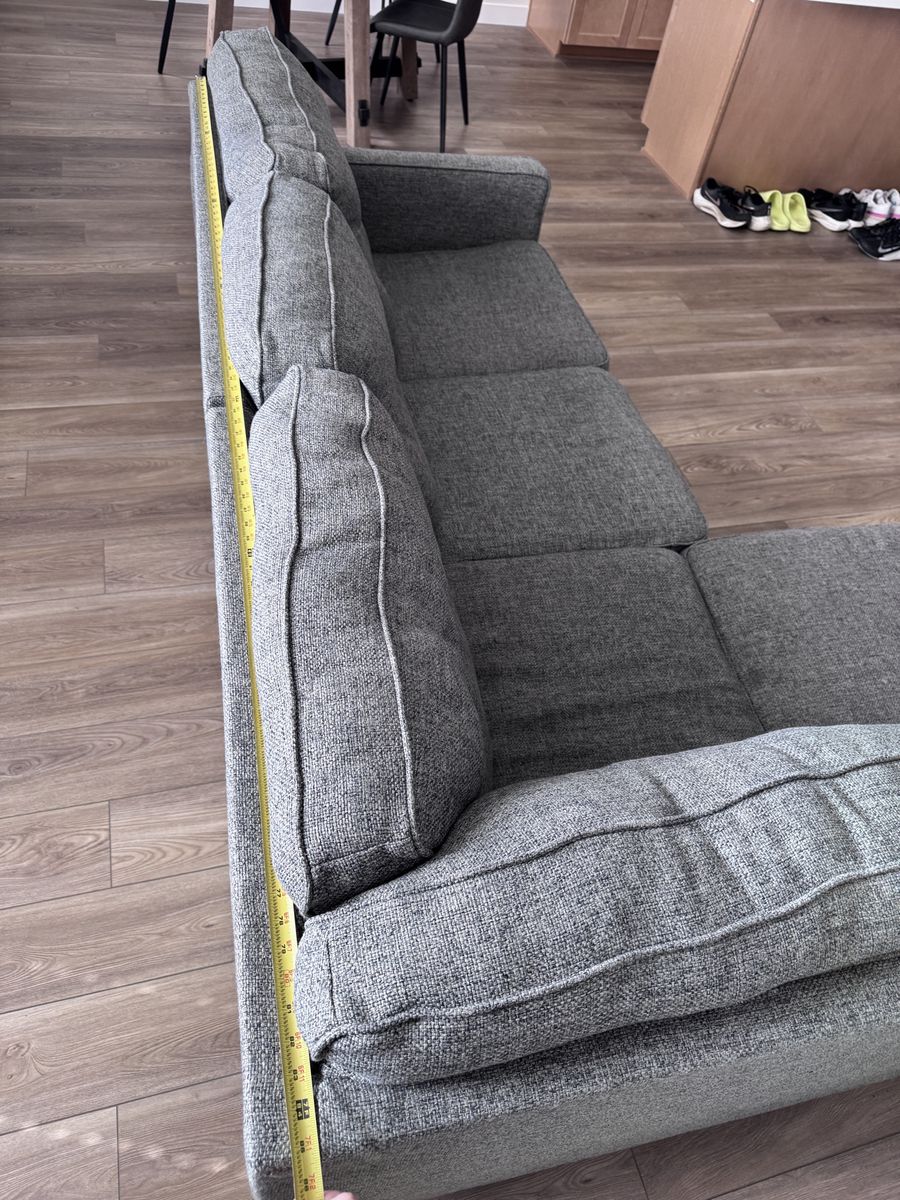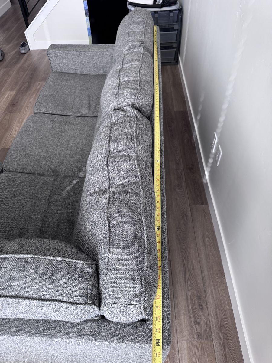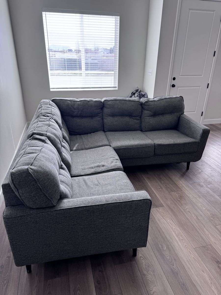 Comfortable gray sectional couch with a modern tufted back. Clean, sturdy, and great for a living room or family room. Plenty of seating and a neutral color that matches almost anything. Measurements in pictures.