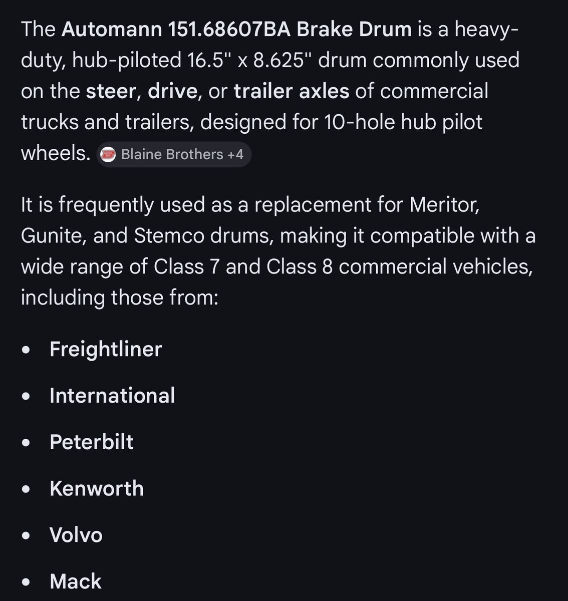 The Automann 151.68607BA is a universal 16.5" x 8.625" brake drum designed for heavy-duty trucks and trailers. It is a very common part used across multiple brands, generally fitting applications that utilize popular hubs such as 150.D1101, 150.T1101, and Gunite 3807AX. Wofford Truck Parts Wofford Truck Parts +4 Key Vehicle Compatibility: Freightliner: Commonly used with N42A1658625B (and similar numbers). Meritor: Compatible with 063123570002 and 123570 hubs. Webb: Replaces 56855B, 66809B, and 66854B series drums. General Application: Fits most standard heavy-duty tractor and trailer axles with 10-hole, 11.25" bolt circle configurations. Wofford Truck Parts Wofford Truck Parts +2 Specifications for Verification: Brake Size: 16.5" x 8.625" Bolt Holes: 10 @ 1.000" Bolt Circle Diameter: 11.25" Pilot Diameter: 8.780" Overall Depth: 11.39"