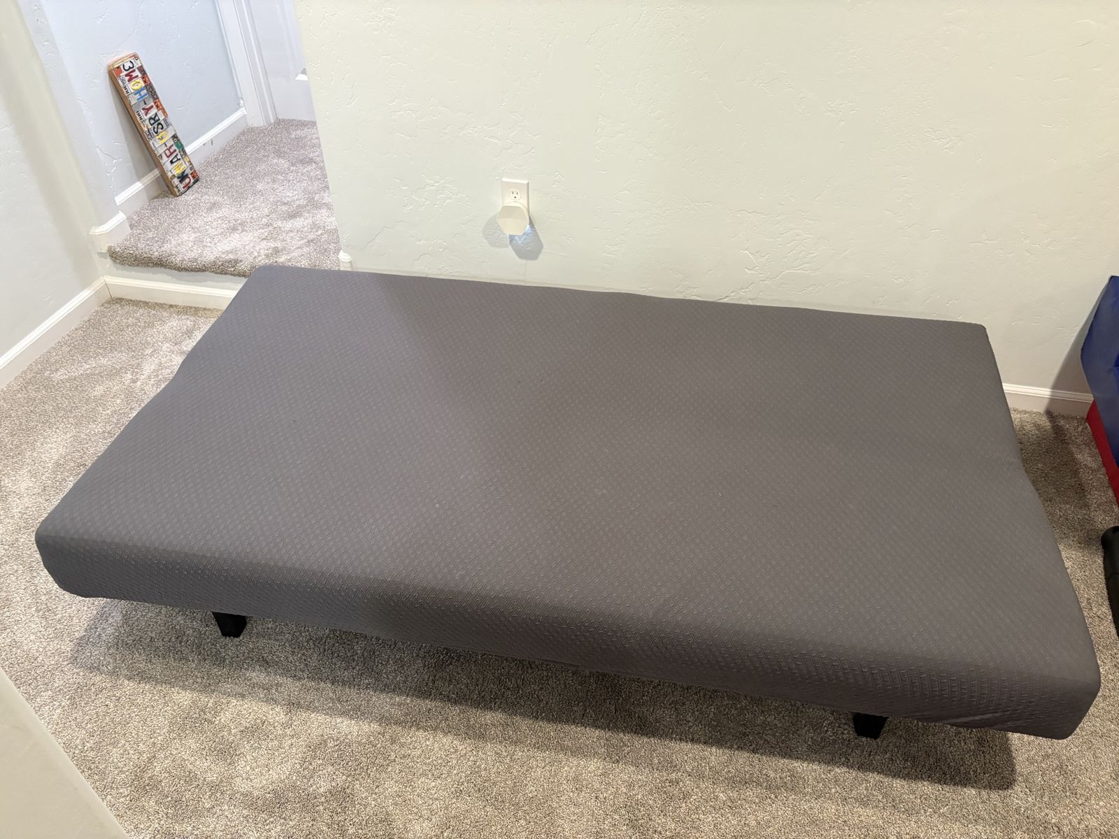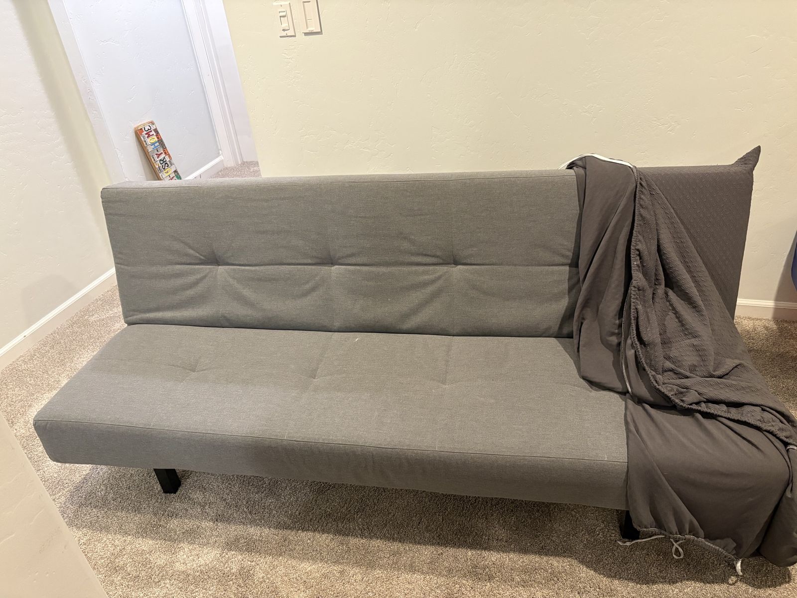 VenmoBlack metal frame futon with light grey mattress. Comes with an extra dark grey slip cover. When it is in couch position: 6’ long x 2’ 5” tall x 2’ 7” deep. When it is in bed position the mattress will be a Full size at approx. 6’ x 5’. In really condition. No pets and nonsmoking home.