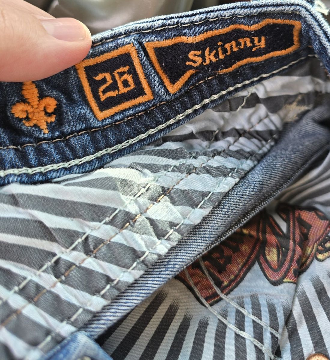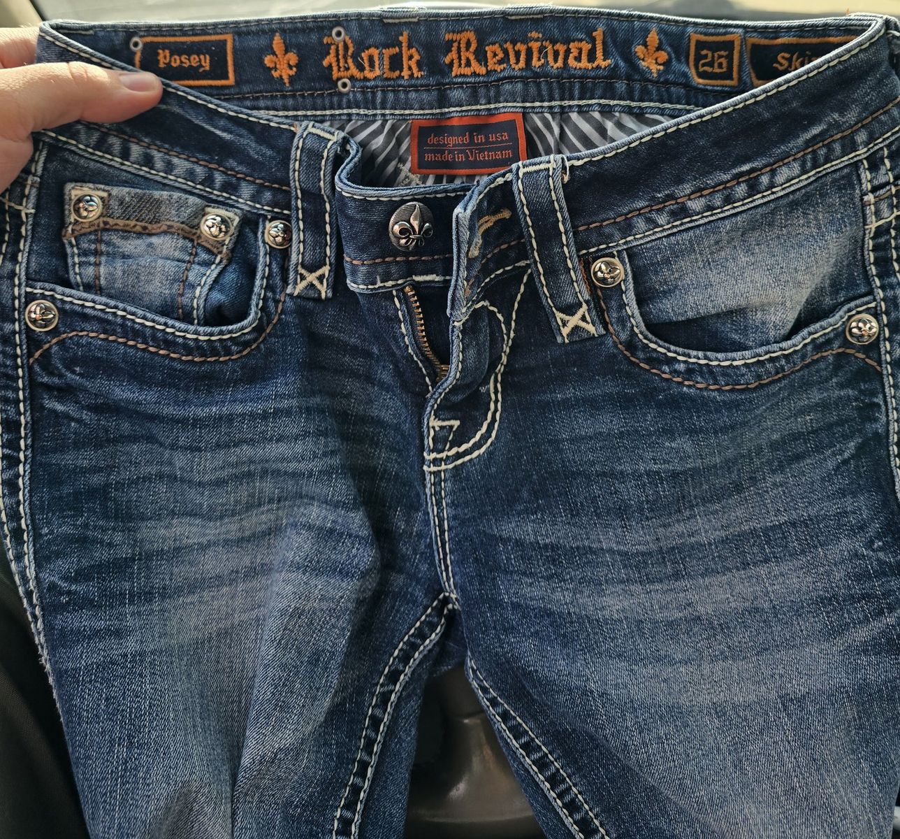 PayPalBrand: Rock Revival Style: Posey S201 / HKP92275201 Fit: Skinny Size: 26 Original MSRP: $160.00+ Product Details: Score these premium Rock Revival "Posey" skinny jeans for a fraction of the original retail price! These jeans feature the iconic heavy thick-stitch detailing and signature fleur-de-lis hardware that make the brand a collector favorite. Designed with a versatile medium wash and light whiskering, they offer a premium, high-end look. The back pockets are fully embellished with intricate embroidery and button-flap closures. Condition: Excellent pre-owned condition. All metal hardware is intact and the embroidery is clean and vibrant. Hems and pockets show minimal wear (please see high-resolution photos for exact condition).