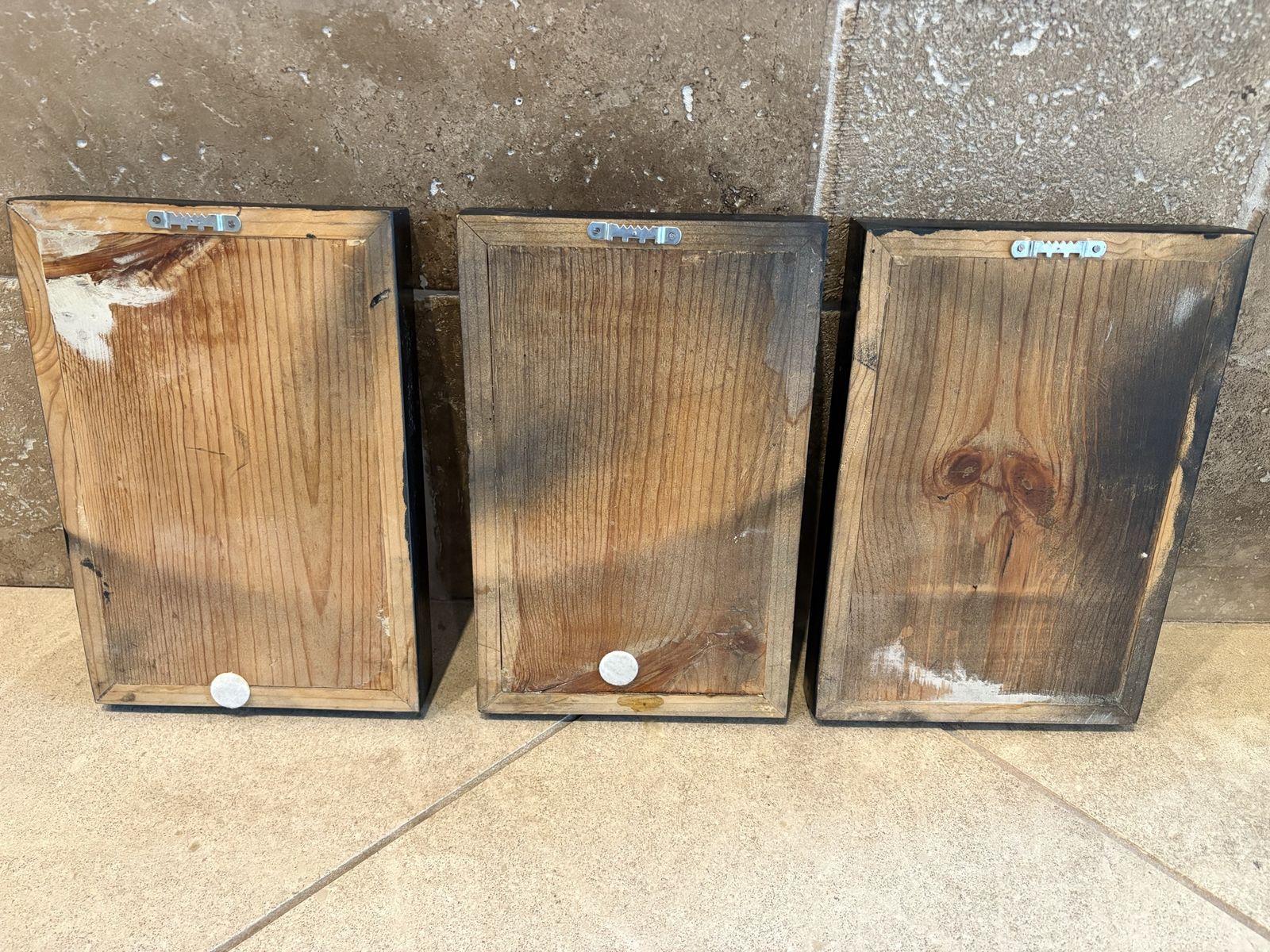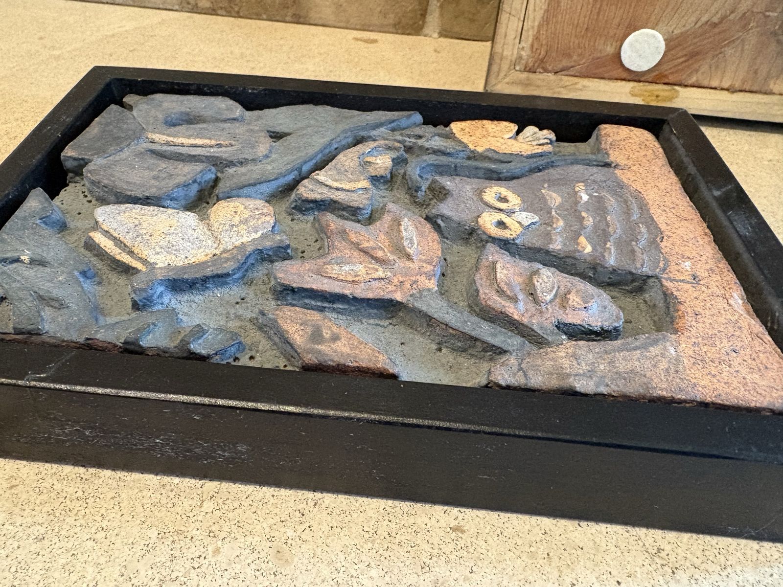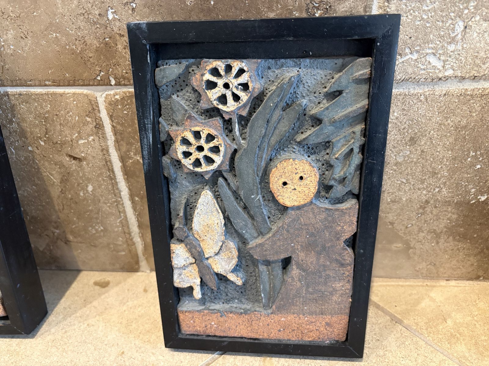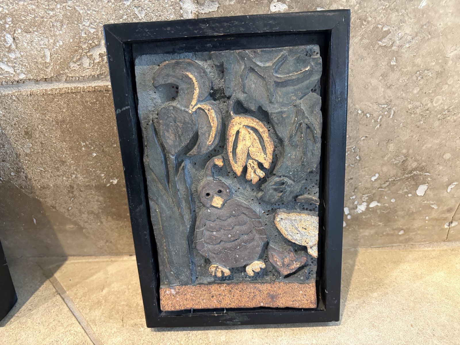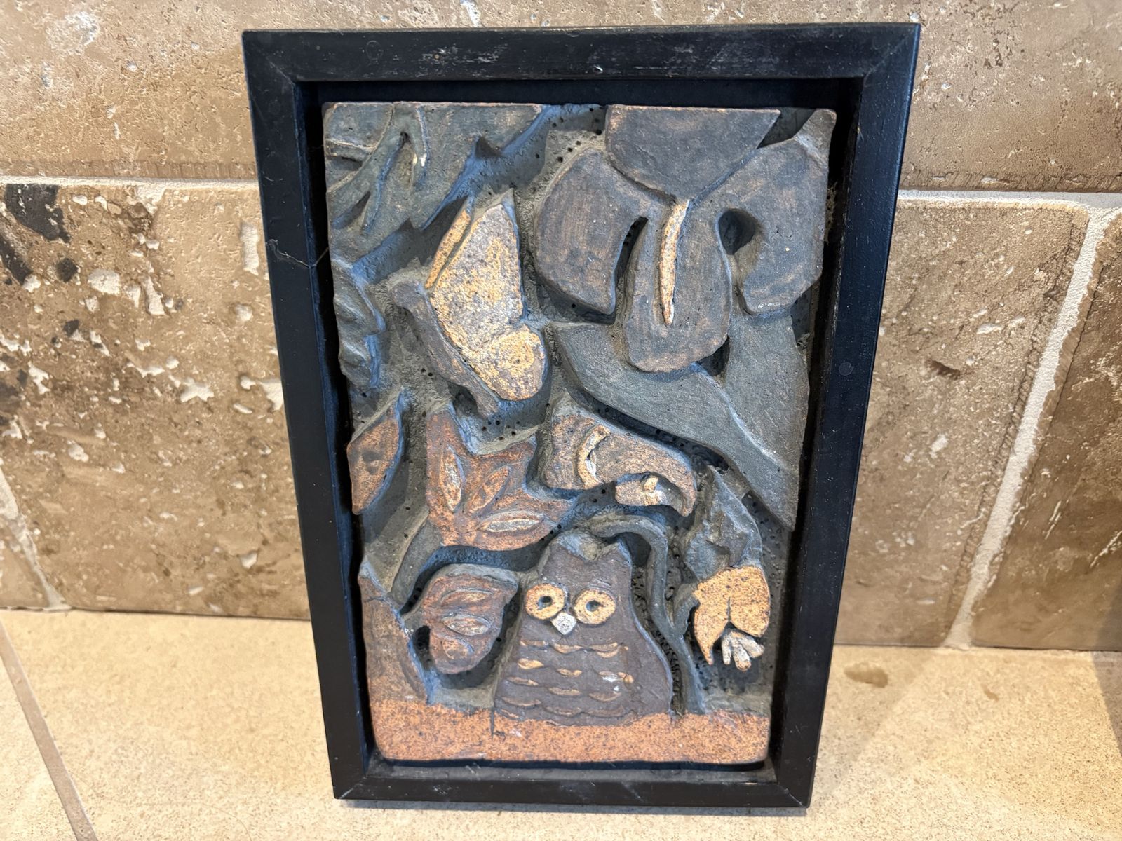 I have 3 original pieces of bas-relief nature art by a local artist. They are hard like stone and could be plaster or something like that. They are attached to the wood frames they are in which are painted black. One is an owl under plants, one is a little human-like creature like a woodsprite under flowers with a butterfly and one is a quail under leaves. Each one is 10 inches tall and 6 3/4 inches wide. They are 1 1/2 inches thick. There is hardware on the backs for hanging. They are unsigned but the artist was Julie Parker. She lived in Salt Lake and passed away last year. The price is for all of them together. See my other ads for jewelry, artwork, home decor and more.