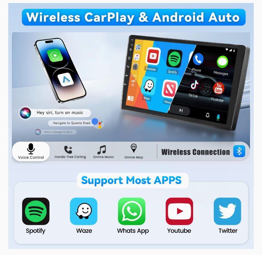 Wireless CarPlay & Wireless Android Auto: Connect your smartphone automatically via Bluetooth wireless—no cables needed. Enjoy hands‑free calling, music streaming, GPS navigation, and voice‑assistant control the moment you start your vehicle. (Wired CarPlay/Android Auto not supported.)