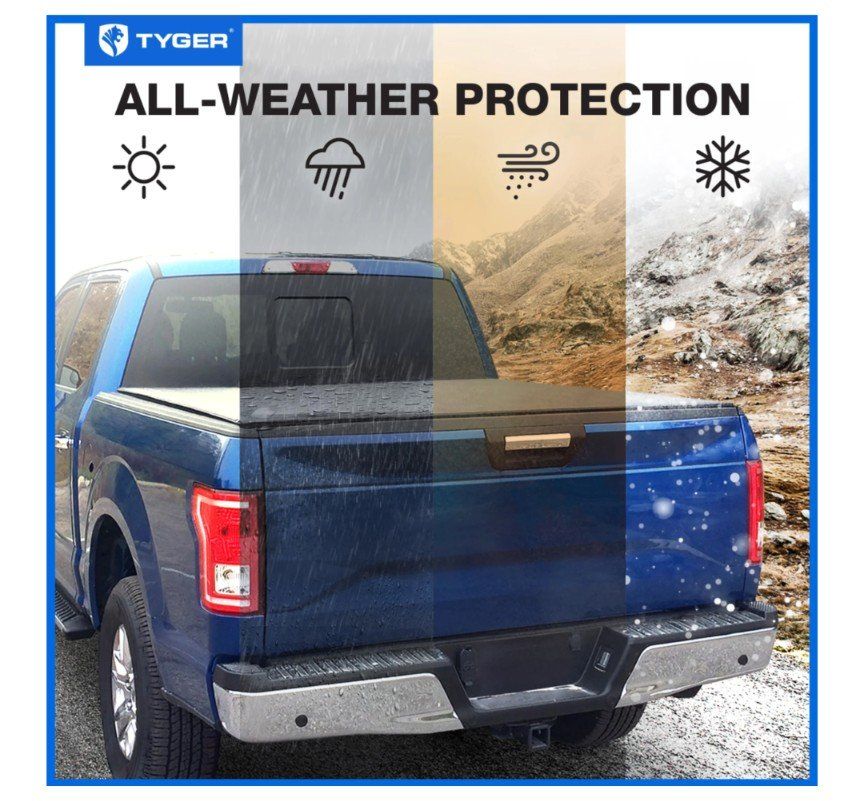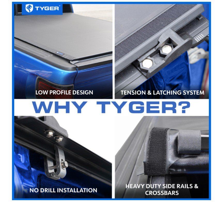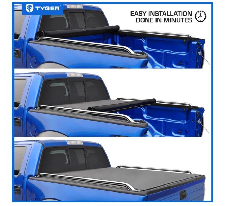DESIGN - Sleek low-profile design allows the cover rails to extend over the bed space to fully utilize the bed rail surface and stake pockets for mounting other truck bed accessories. Cover is dual-coated and made out of heavy duty 24oz. marine-grade vinyl, with built-in horizontal crossbars to offer structural support; and roll up with the tarp to provide full bed access when in need. Also comes with aircraft-grade aluminum side rails, and stainless steel clamps for mounting to the truck bed.