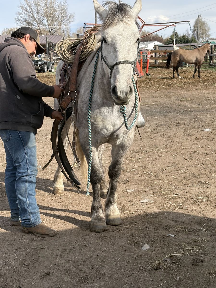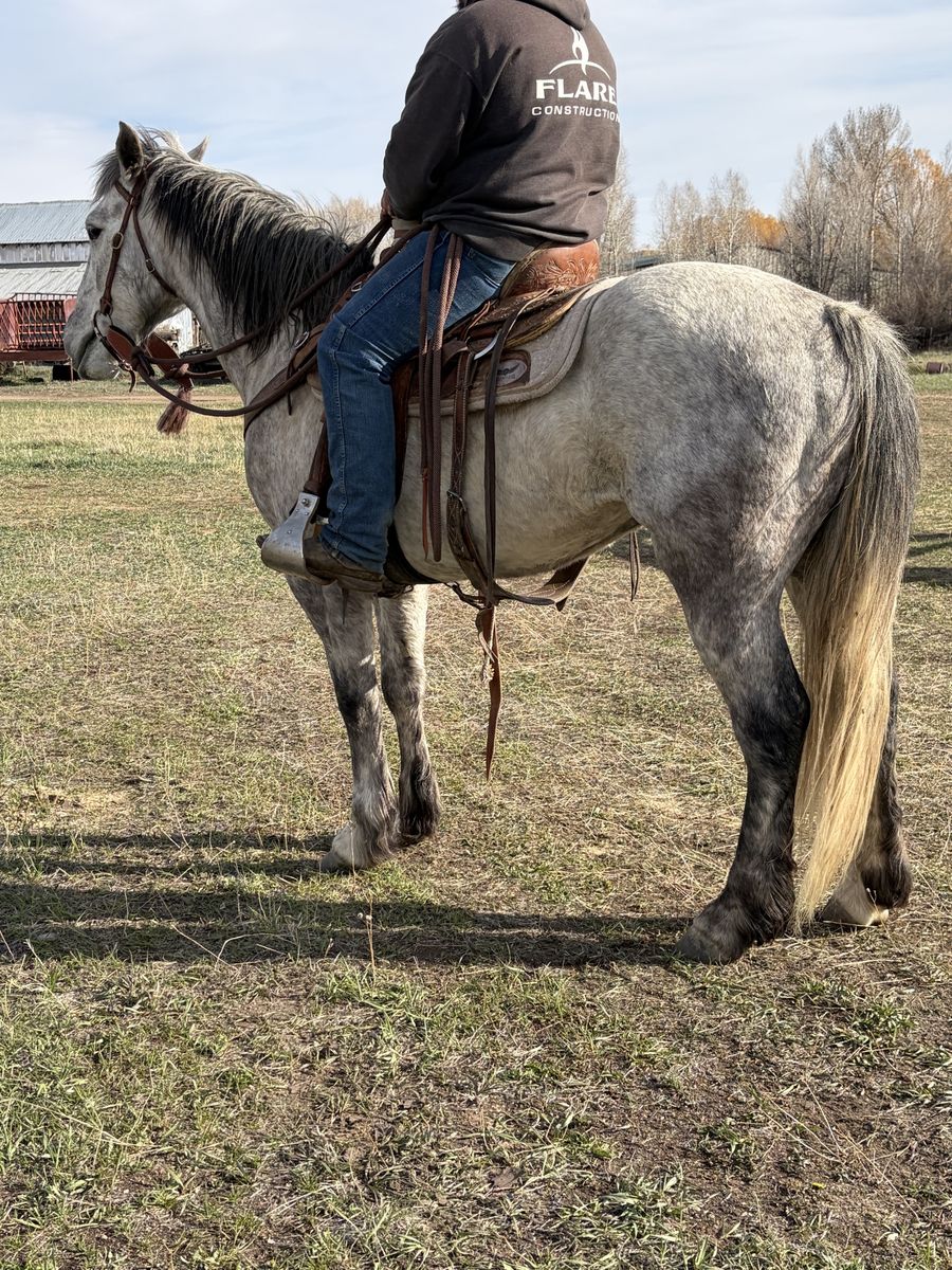 Cute little 6 year old grey draft cross gelding. He stands about 14.2-14.3 hh. Ranch using horse. Drug calves to the fire. Use him to hunt and trail ride! Big bone and sound! He’s not a horse I would classify as “kid safe” He’s not a bucker and he’s not mean, but he’s a using horse that needs a job! Fairly good for a farrier but he’s used to a table so just needs patience. Located in Evanston wy 6🥕🥕🥕