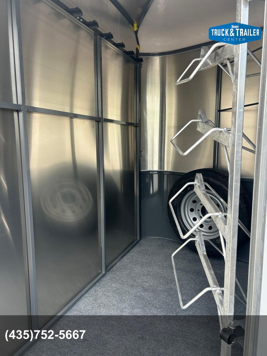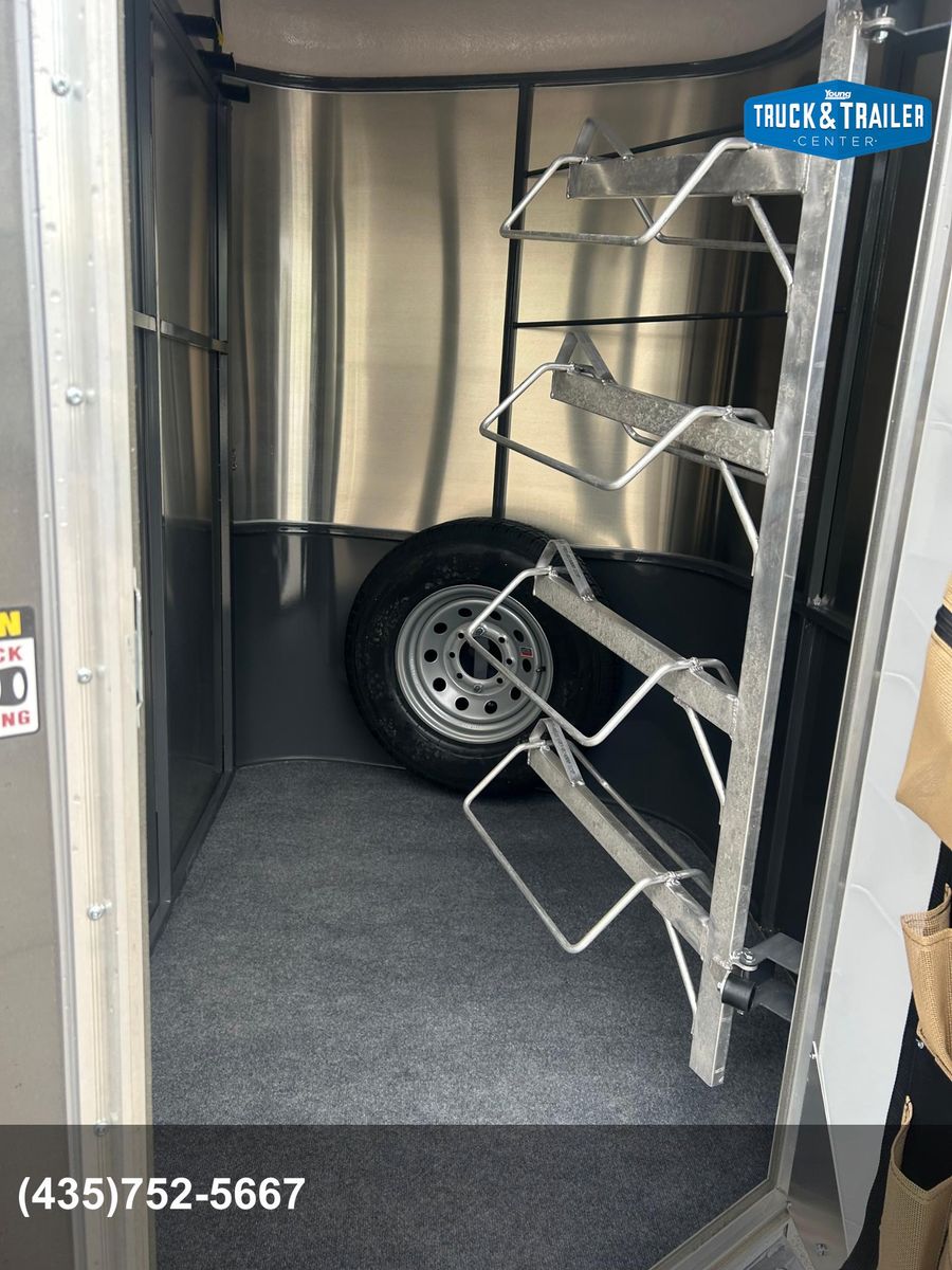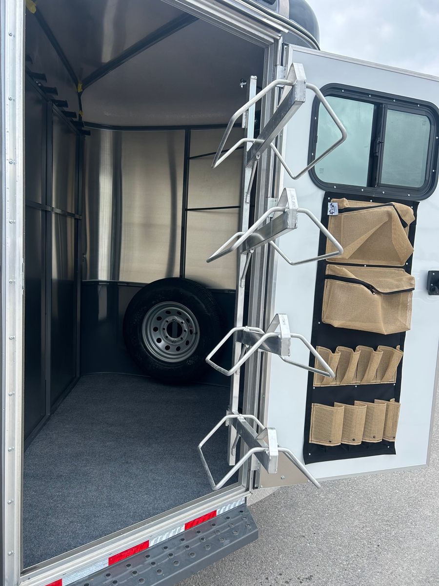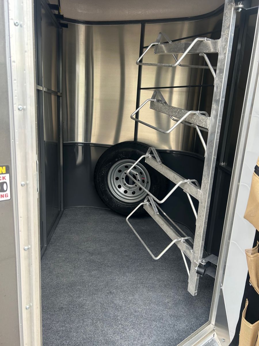 4 Horse Bumper Pull Front Tack Room Swing out Saddle Racks Bridle Hooks Horse Area Has Floor Mats Aluminum Jail Bar Dividers w/ Pads Spare Tire