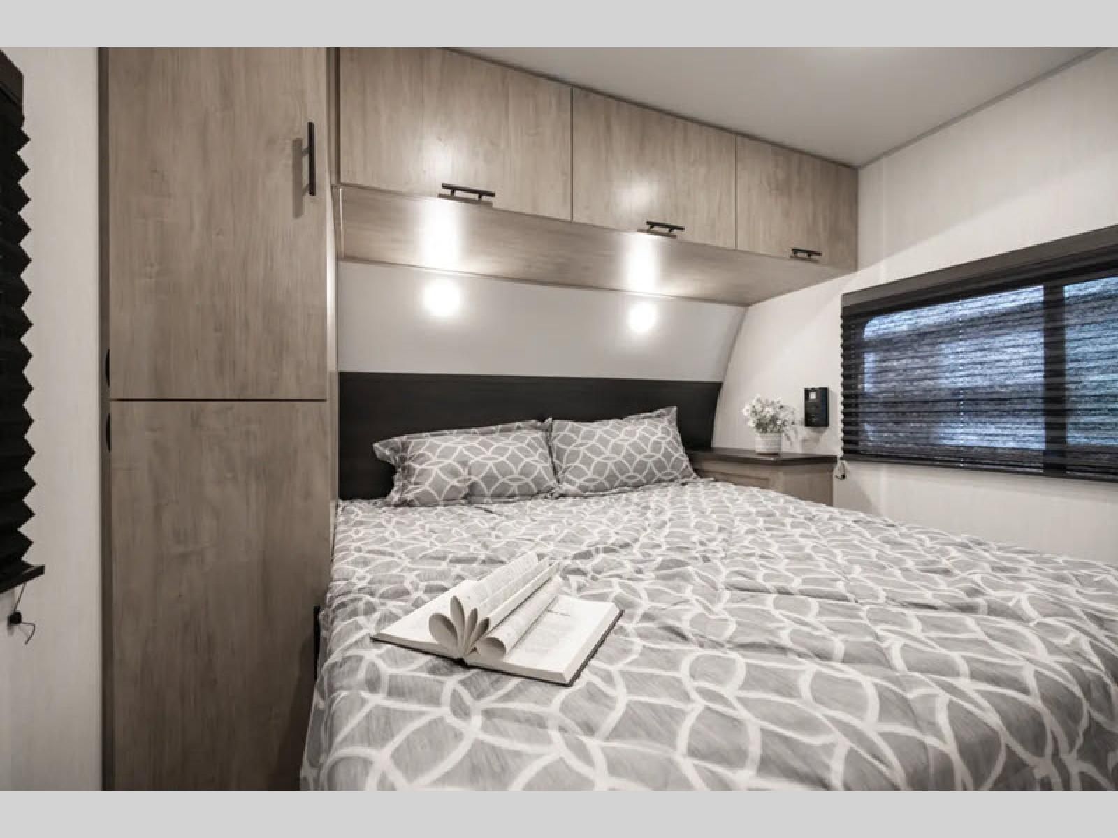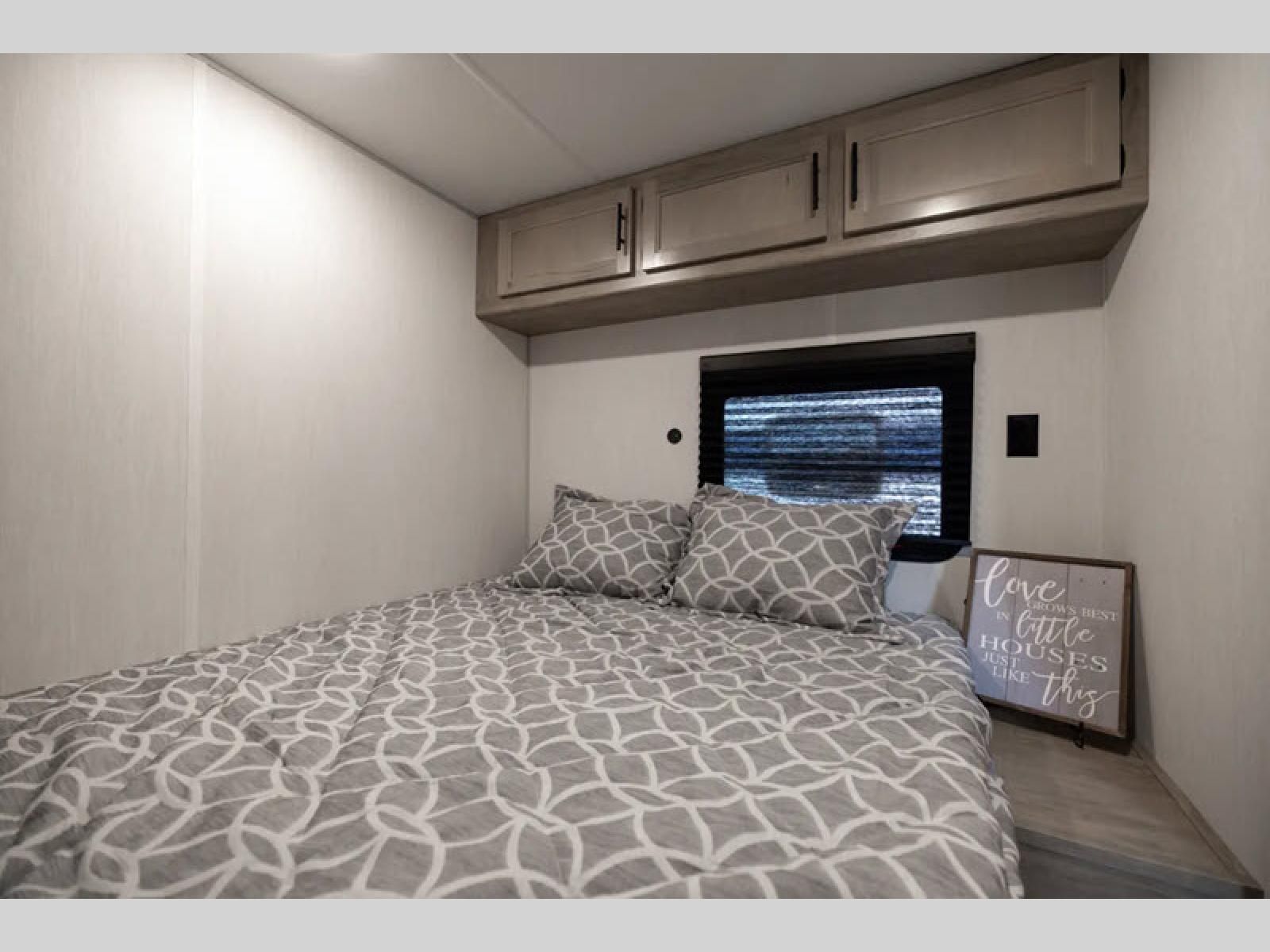 This Grey Wolf travel trailer features a two-bedroom layout with sleeping areas on both ends. The front includes a private bedroom, while the rear offers a second private bedroom, giving separate spaces for multiple campers.