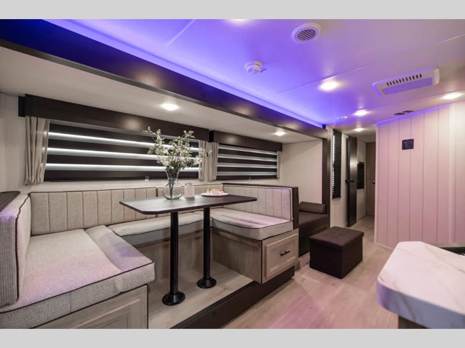 The main living area is centered and includes a large slide-out with a U-shaped dinette and sofa, both of which can provide additional sleeping space if needed. The kitchen sits along the main wall and includes a refrigerator, cooktop, microwave with air fryer, and a pantry for storage.