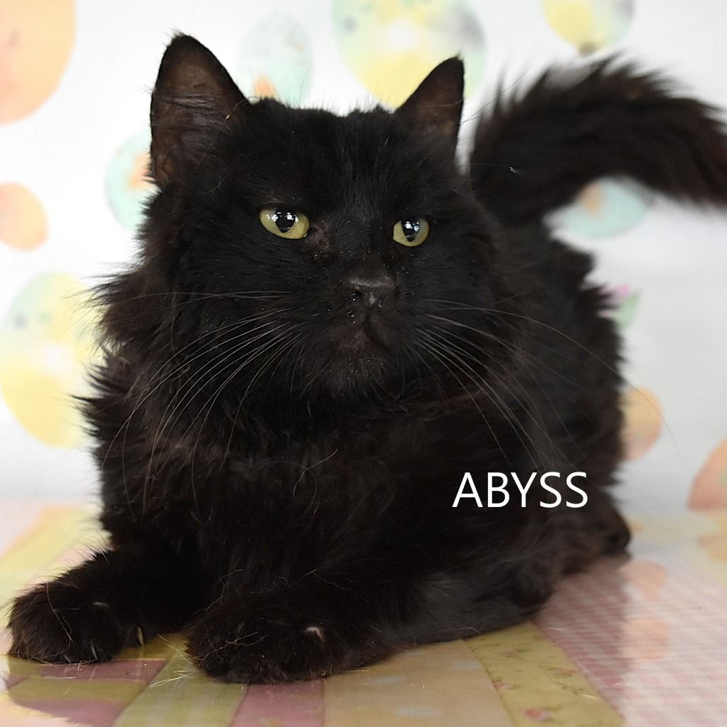 Meet Abyss — a dapper gentleman with a soft, luxurious black medium-length coat. His glowing green eyes demand your attention. But don’t let his dramatic good looks fool you—Abyss is as affectionate as they come. He loves spending time with his people, whether that’s soaking up pets, lounging nearby or gently reminding you he’s there with a soft nudge. Playtime is one of his favorite things, and he’ll happily chase toys, pounce with enthusiasm and show off his playful spirit. He strikes the perfect balance between fun-loving energy and cozy companionship. If you’re looking for a cat who brings both beauty and heart into your home, Abyss is ready to be your loyal shadow and playful partner.