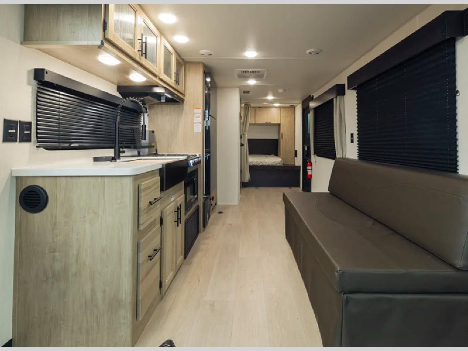 The main living area includes a kitchen with a refrigerator, cooktop, microwave, and pantry, along with overhead cabinets for added storage. Up front, there is a bed with a bedside wardrobe and additional storage space.