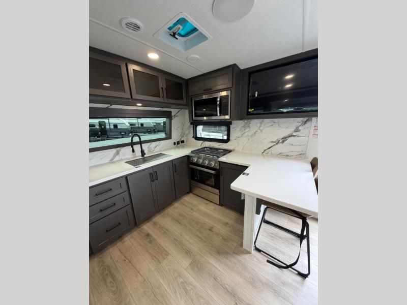 Kitchen: 12V 11 cu. ft. refrigerator, 3-burner recessed range with oven and a microwave oven above