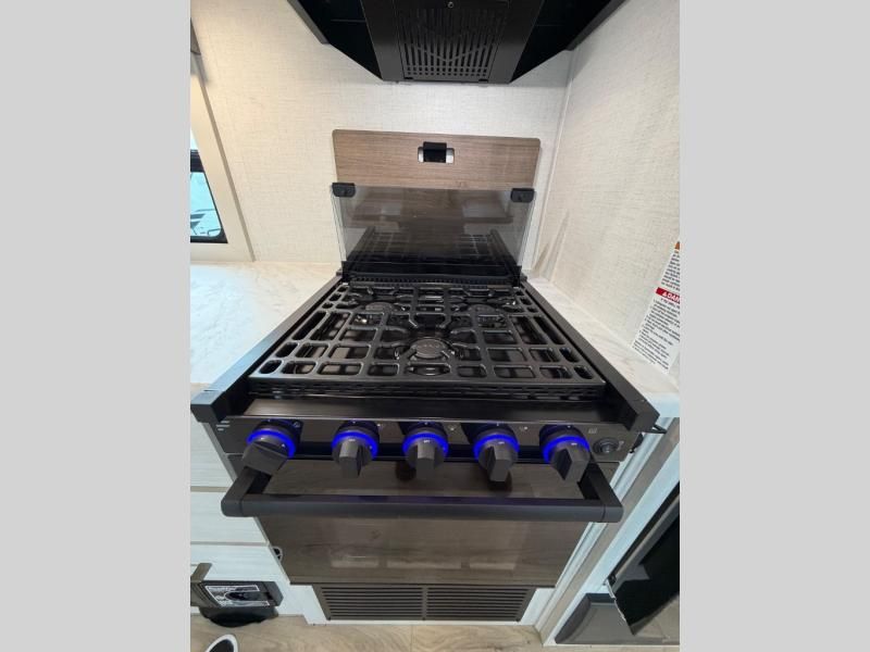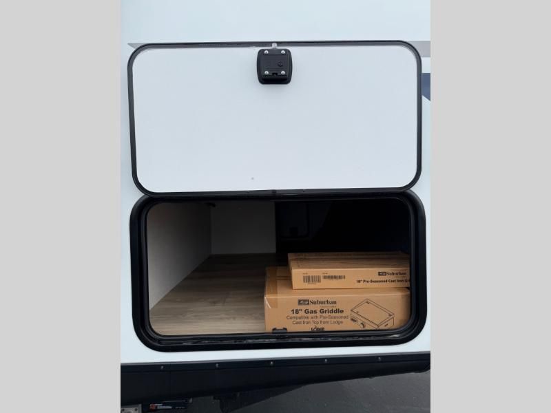 Exterior: 21' Power awning with LED light strip and an outdoor kitchen including a griddle and fridge
