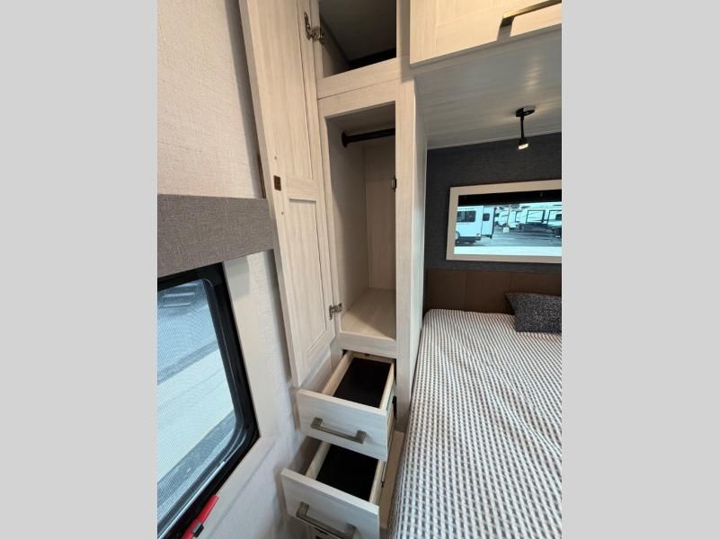 Master Suite: Private front bedroom with a residential 60" x 80" Queen bed and dual bedside wardrobes