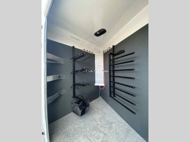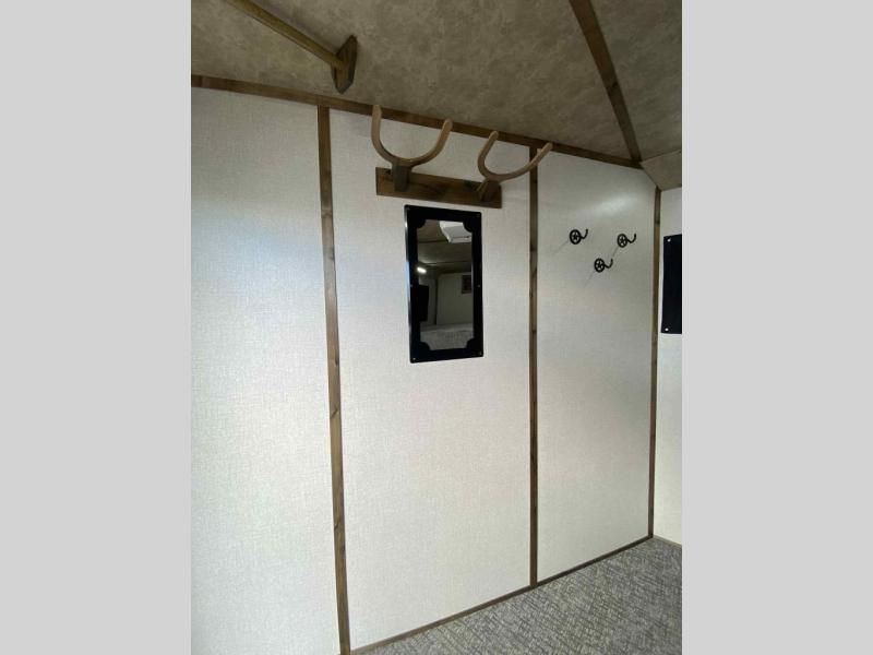 Massive front dressing room/tack area with carpeted floor and bulkhead wall