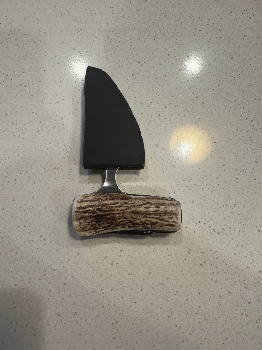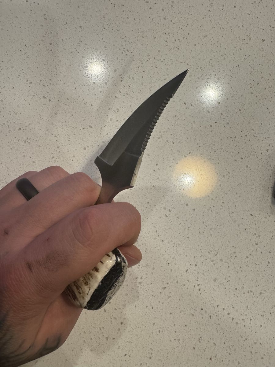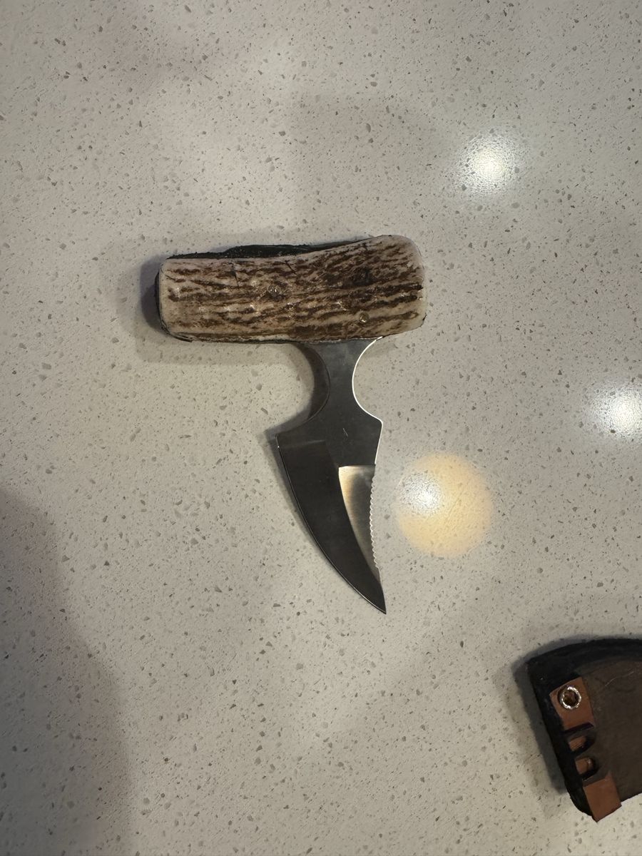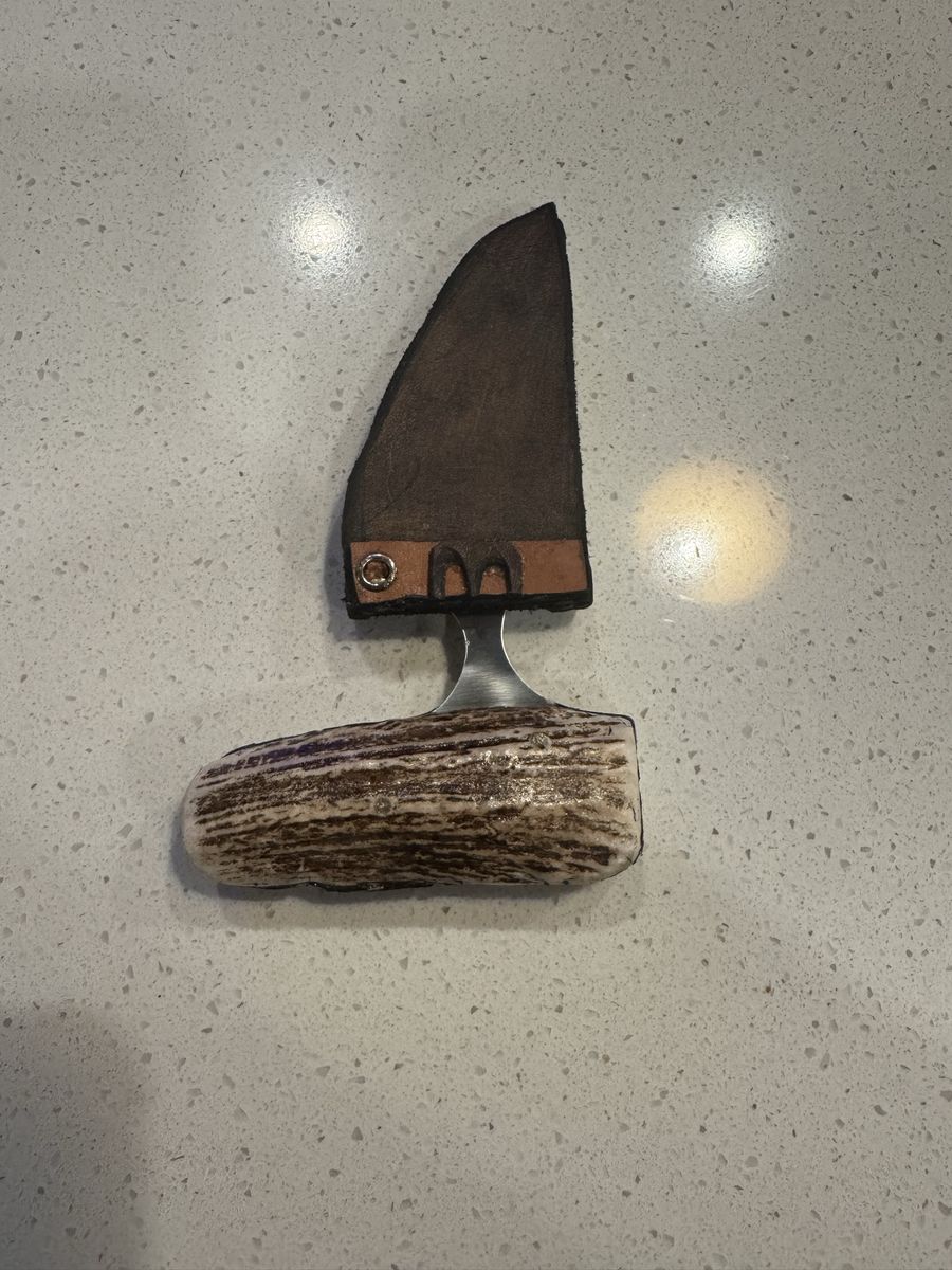 3in blade, 5in overall. Hand made. Highest quality components. Razor sharp. Brand new, genuine leather cover with authentic antler hilt.